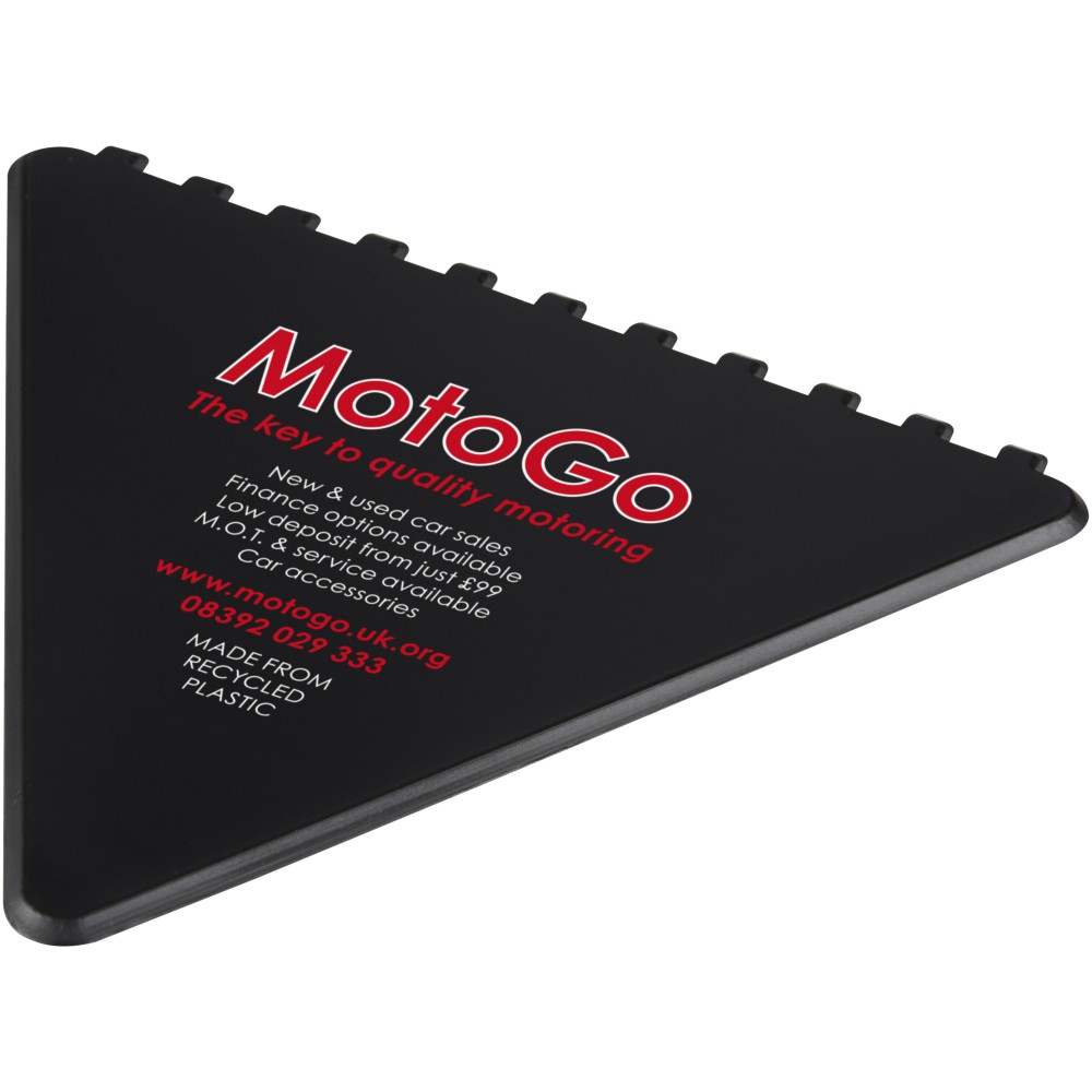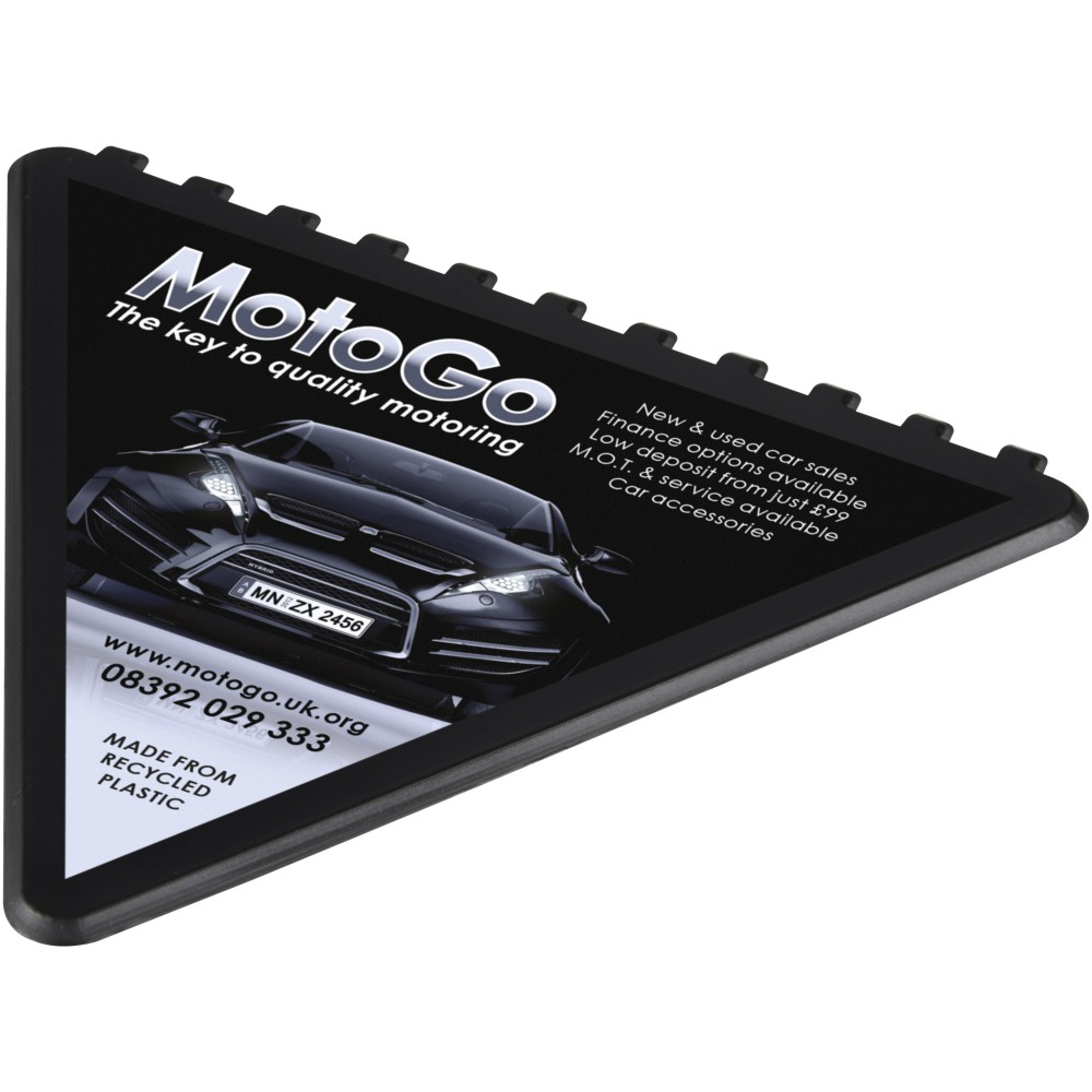 Háromszög alakú jégkaparó nagy emblémázható felülettel. Az Egyesült Királyságban készült újrahasznosított műanyagból.