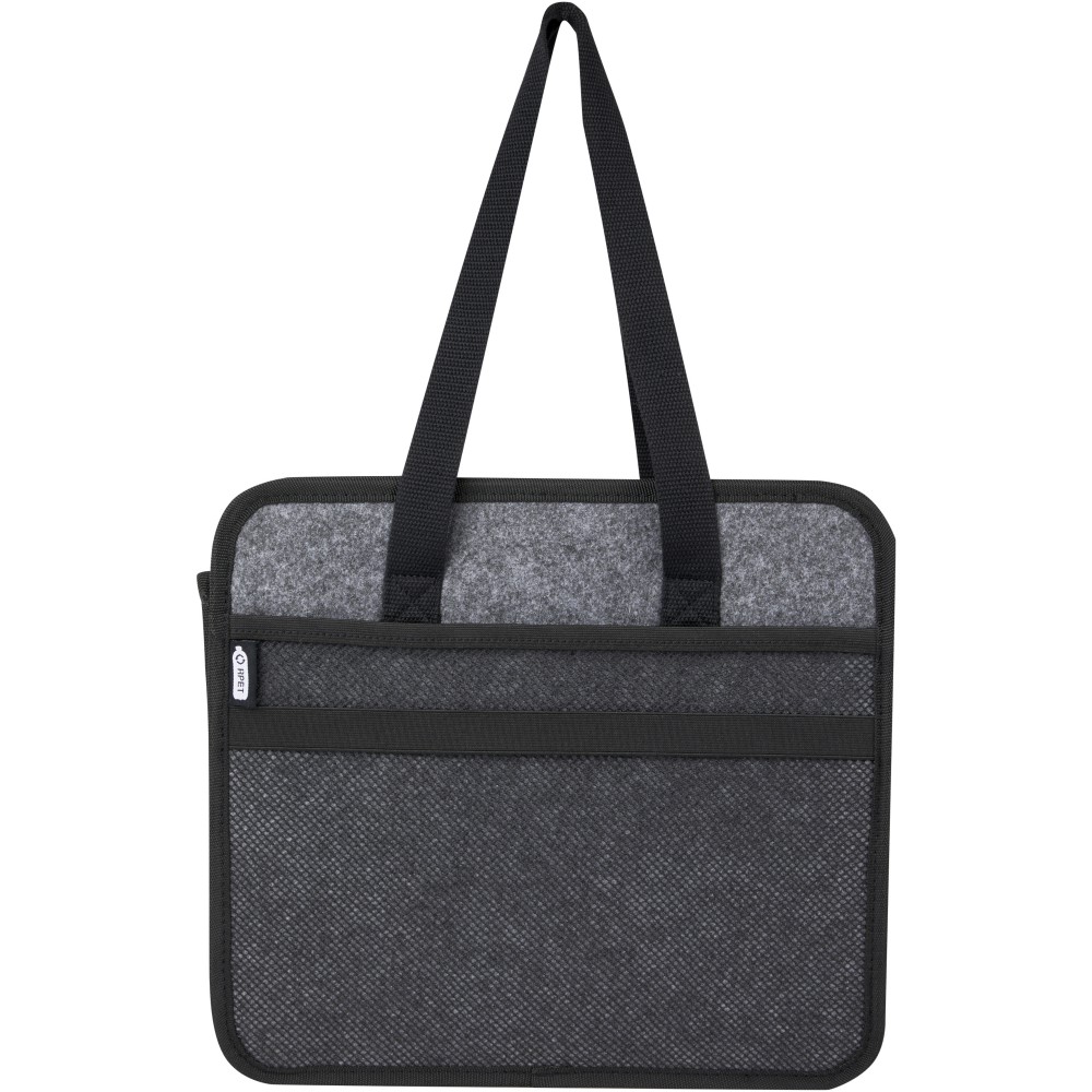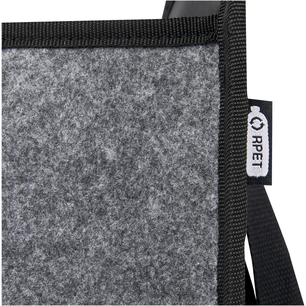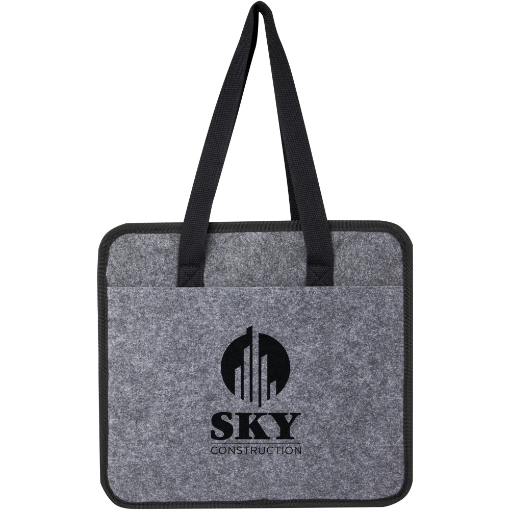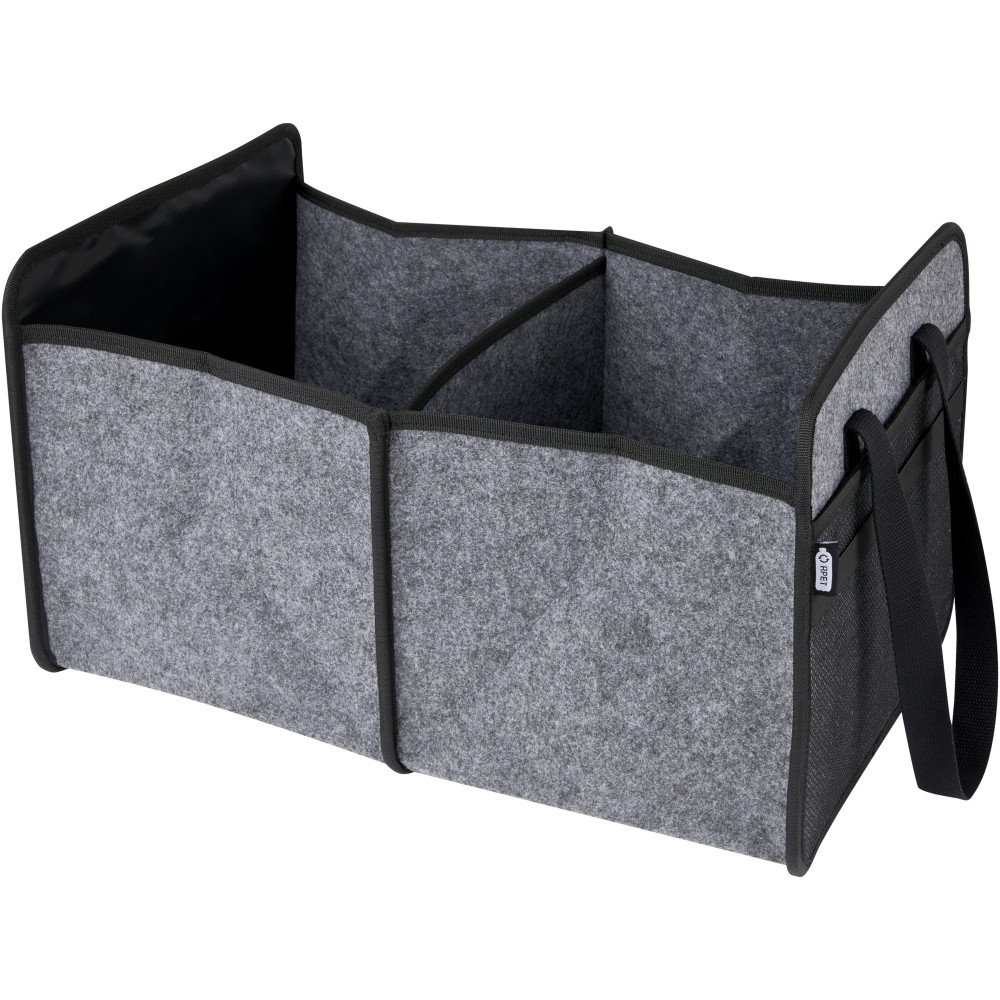Puha és tartós, kiváló minőségű, GRS tanúsítvánnyal rendelkező újrahasznosított filcből készült összecsukható táska. 2 nagy rekesszel, megerősített alsó lapokkal, elülső zsebbel, hálós zsebbel és 2 hosszú szövött pamut füllel (30 x 2,5 cm). Ideális elektromos járműve töltőkábeleinek tárolására, élelmiszerek szállítására vagy egyszerűen a rend fenntartására az autóban vagy otthon. Minden erőfeszítés nélkül a helyére hajtható, és egy rugalmas pánt gondoskodik arról, hogy szépen összecsukva maradjon. Zárt mélység: 4,5 cm. Nyitott mélység: 48 cm.
