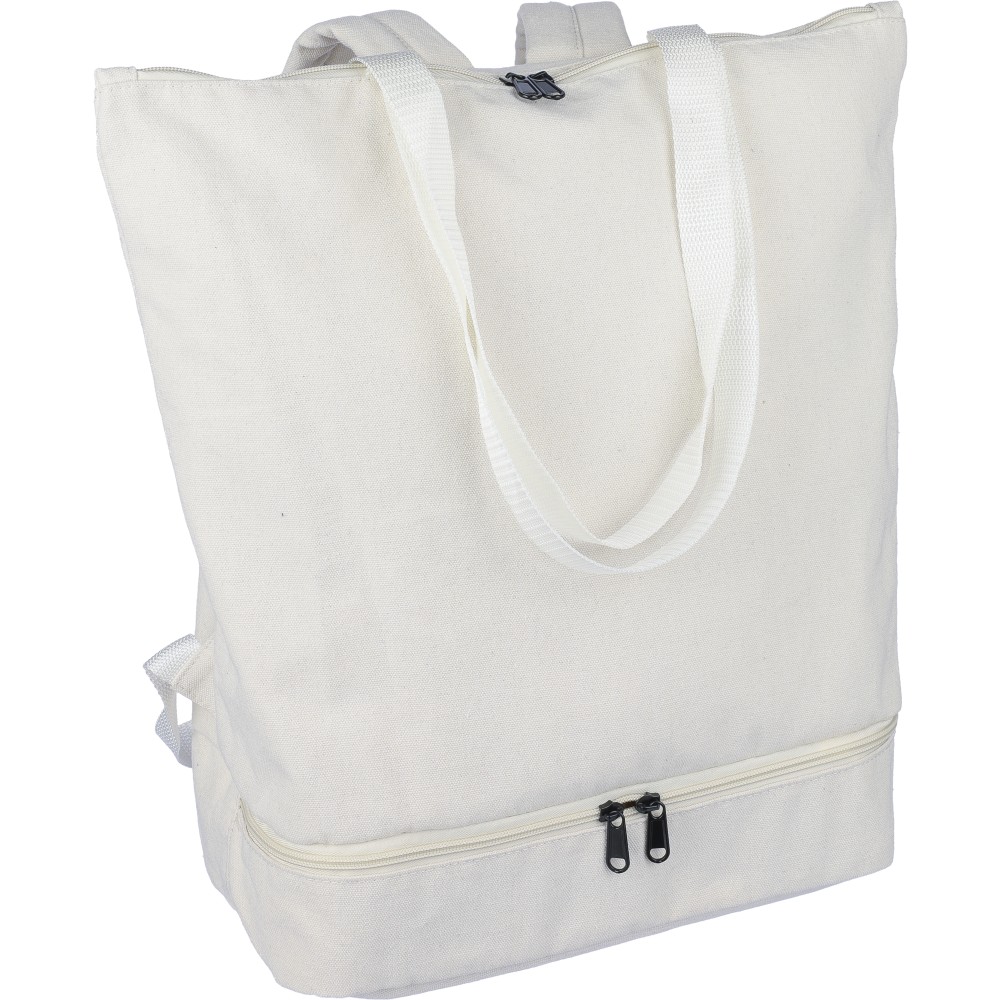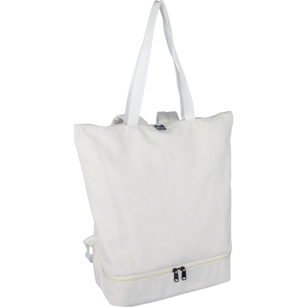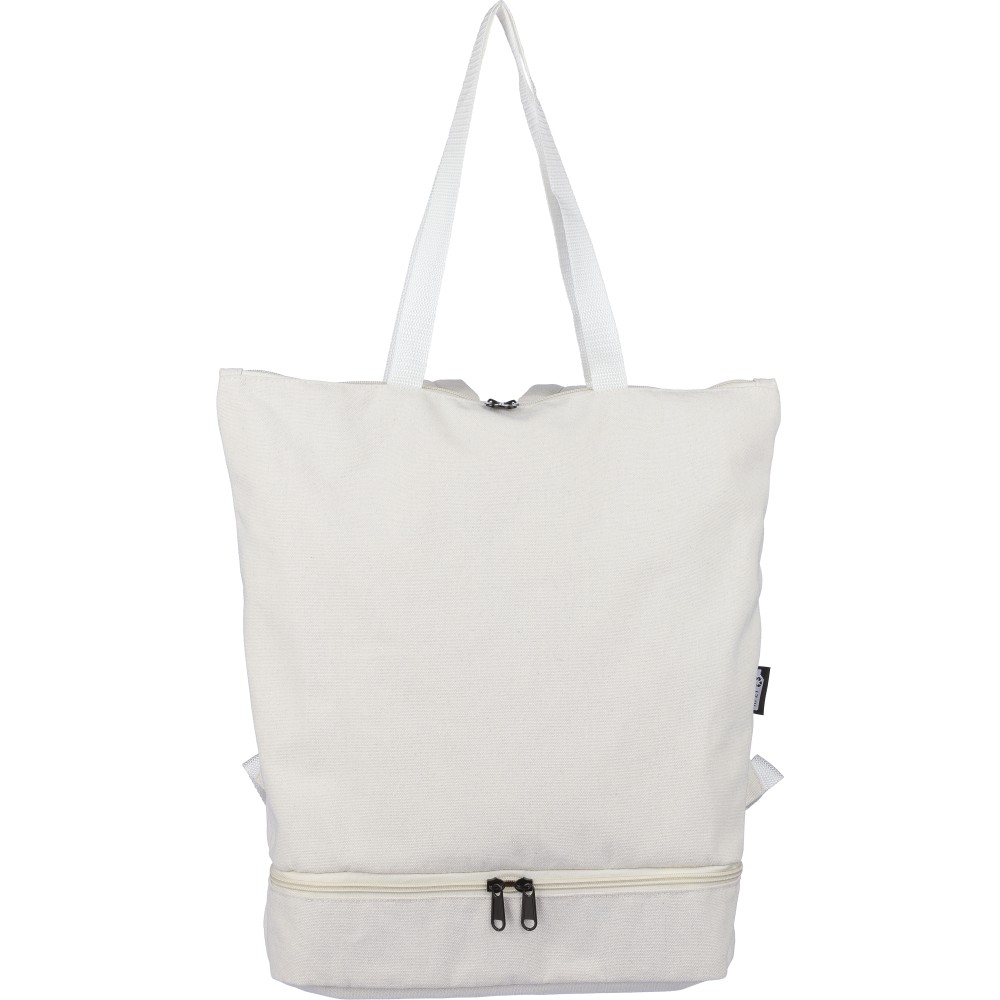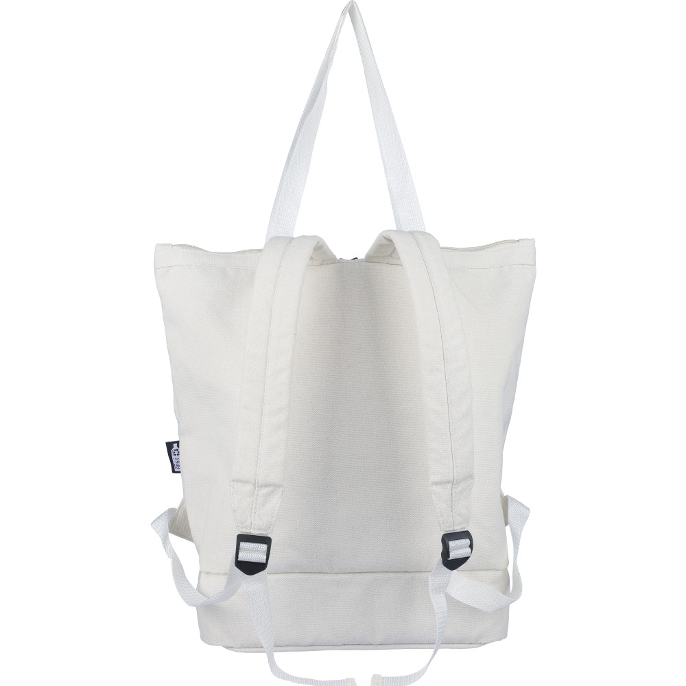 Bevásárlótáska és hátizsák 330 g/m2 újahasznosított policotton anyagból, 210D poliészter béléssel. Egy nagy cipzáras rekesszel a tetején, cipzáras rekesszel az alján, 15 -es laptoptartó résszel, két belső rekesszel és egy külső cipzáras résszel. Hordozófüllel és párnázott, állítható vállpánttal. Űrtartalom: 30 liter, teherbíró képesség: 15 kg. Címkét tartalmaz.