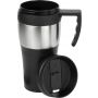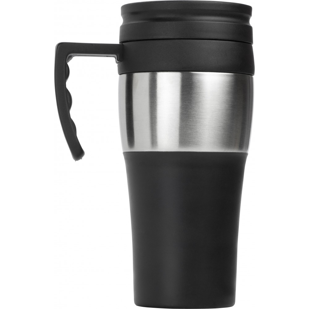 Termoszbögre rozsdamentes acélból és műanyagból. Nem szivárgásmentes. Mosogatógépben nem tisztítható. 500 ml. BPA-mentes műanyag.