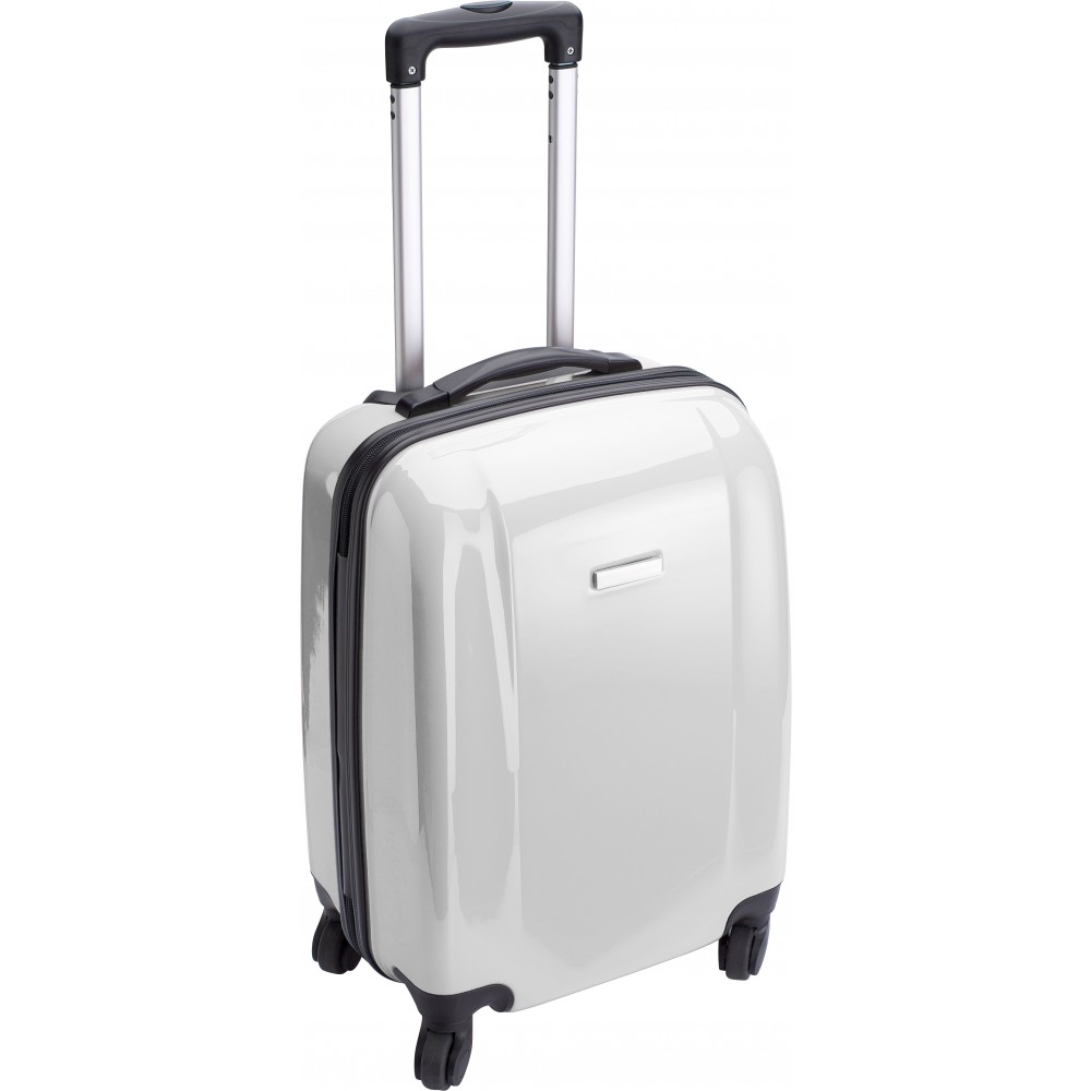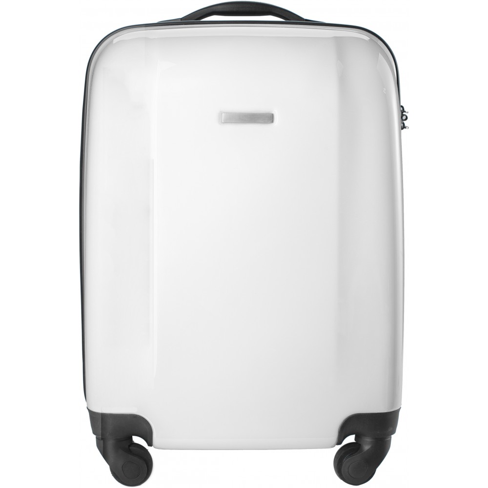 Keményfedelű bőrönd PC/ABS műanyagból, 4 körbeforgó kerékkel, beépített számzárral. Emblémzásra alkalmas fémlappal, ami fixen a terméken van.