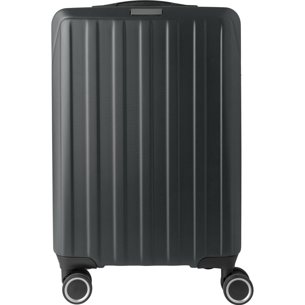 Keményfedeles ABS gurulós bőrönd 8 kerékkel (4x2), és háromszintű fém fogantyúrendszerrel. Felső műanyag fogantyút, számkombinációs zárat és 3M ragasztócsíkkal rögzíthető gravírozható táblát tartalmaz. A belső bélés anyaga 210D, a táskán belül 3 rekesz áll rendelkezésre: U-cipzáras zseb, hálós zseb és X-alakú, csattal záródó gumis heveder. Űrtartalom: 30 liter. Csomagolása barna papírdoboz.