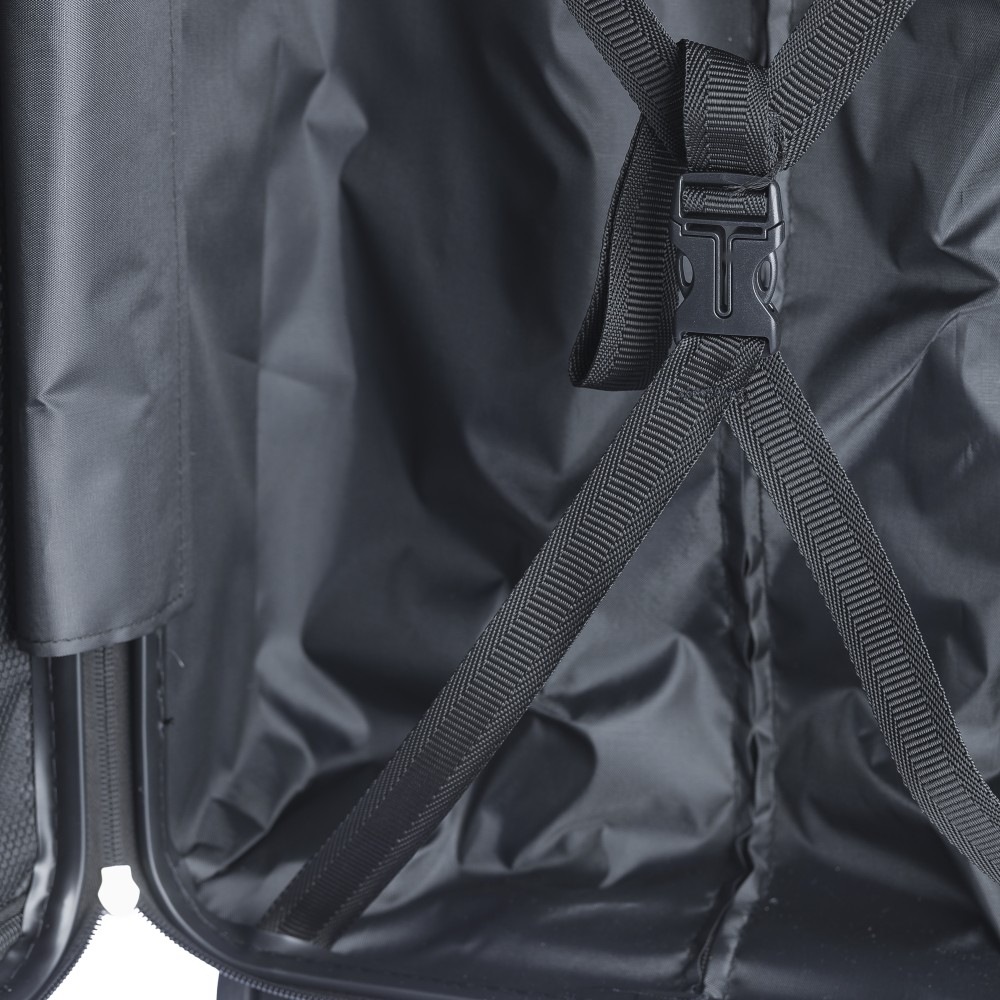 Keményfedeles ABS gurulós bőrönd 8 kerékkel (4x2), és háromszintű fém fogantyúrendszerrel. Felső műanyag fogantyút, számkombinációs zárat és 3M ragasztócsíkkal rögzíthető gravírozható táblát tartalmaz. A belső bélés anyaga 210D, a táskán belül 3 rekesz áll rendelkezésre: U-cipzáras zseb, hálós zseb és X-alakú, csattal záródó gumis heveder. Űrtartalom: 30 liter. Csomagolása barna papírdoboz.