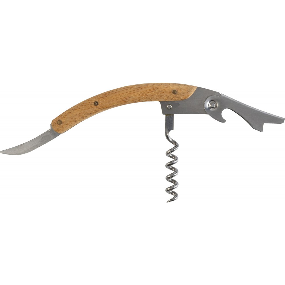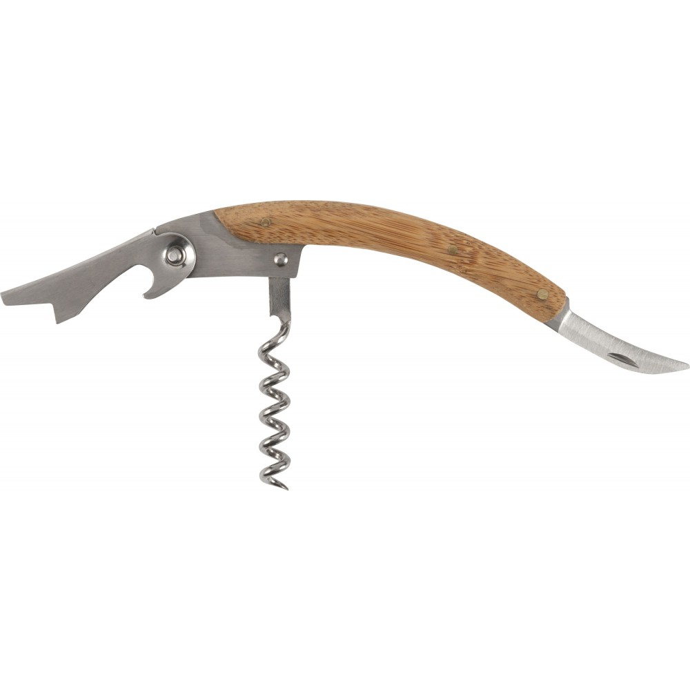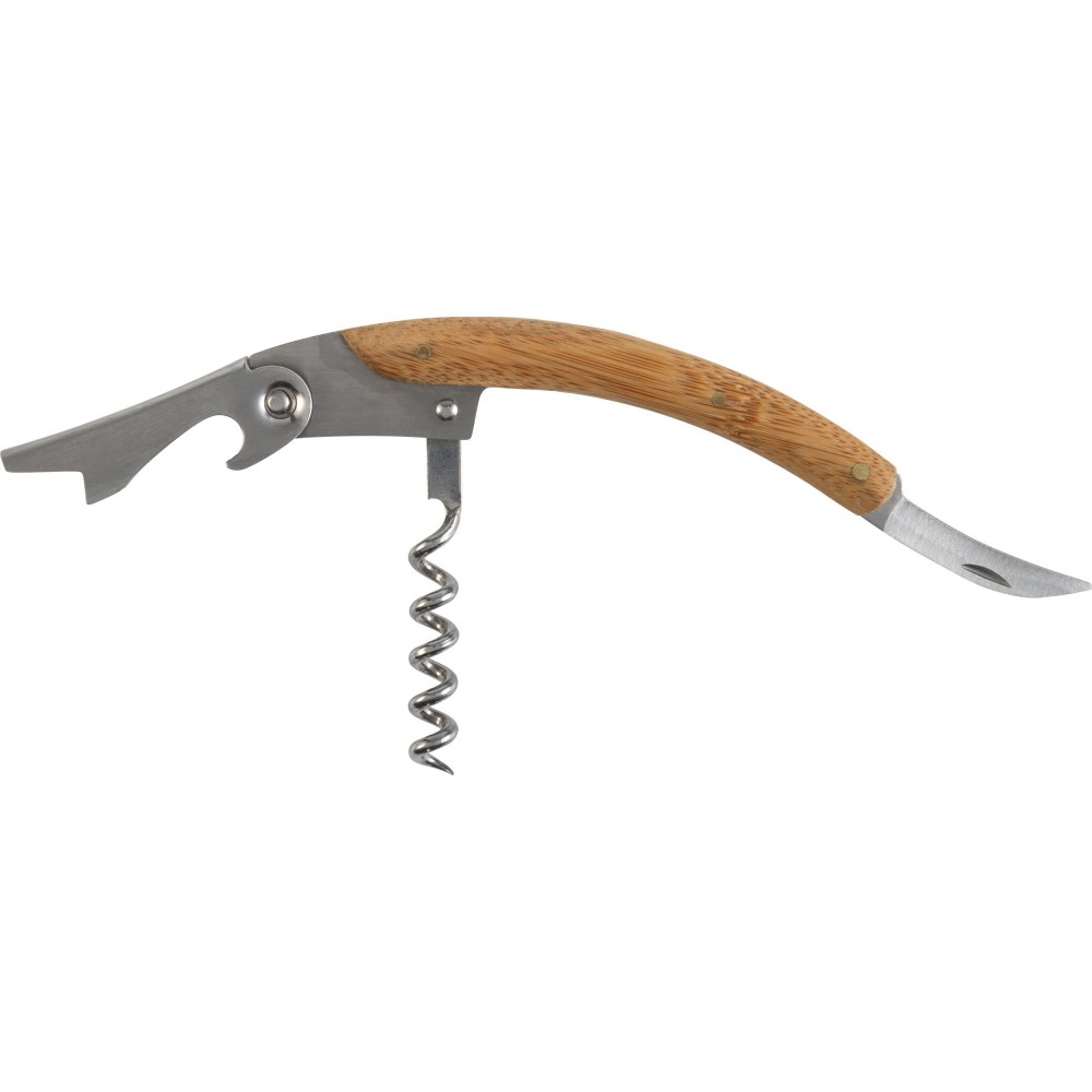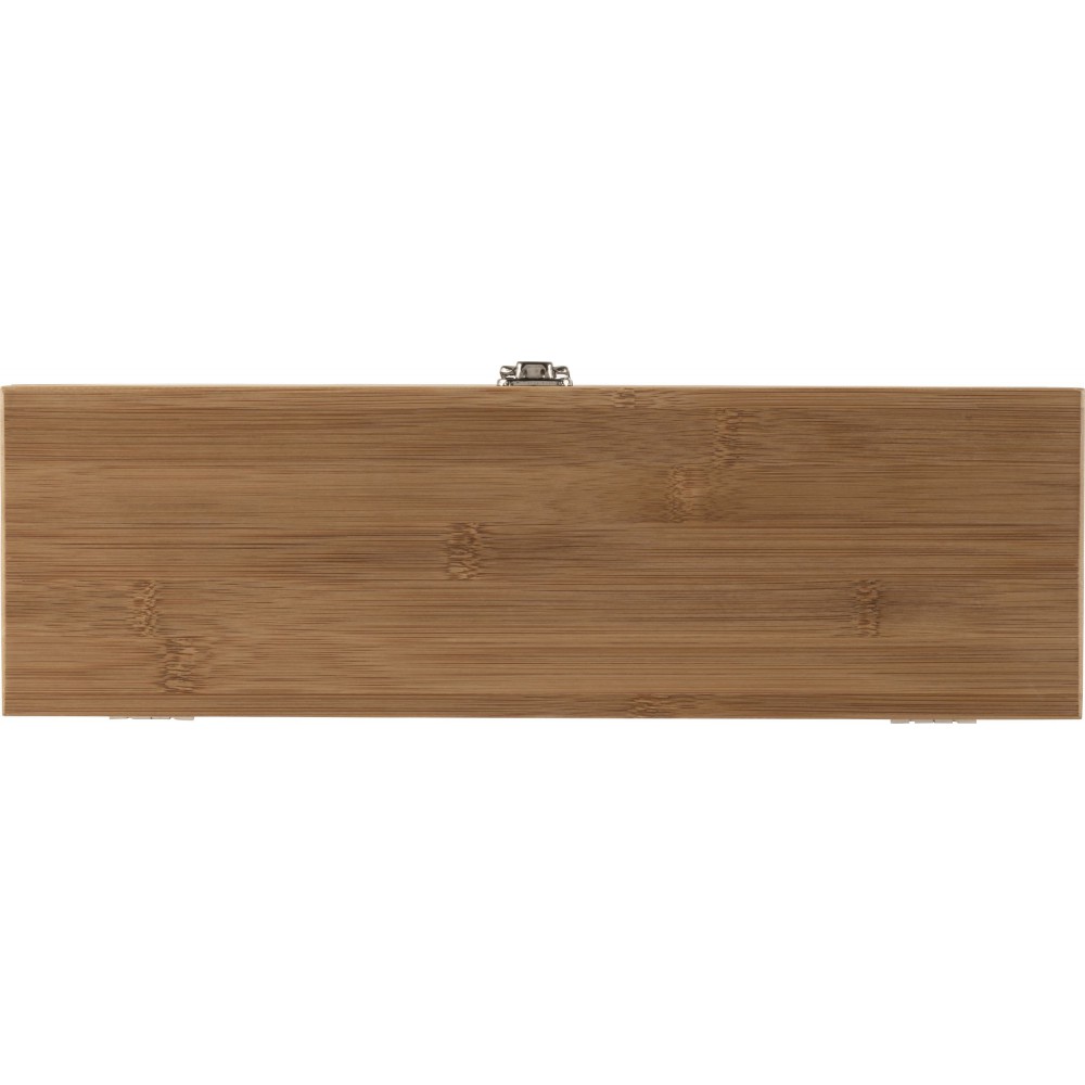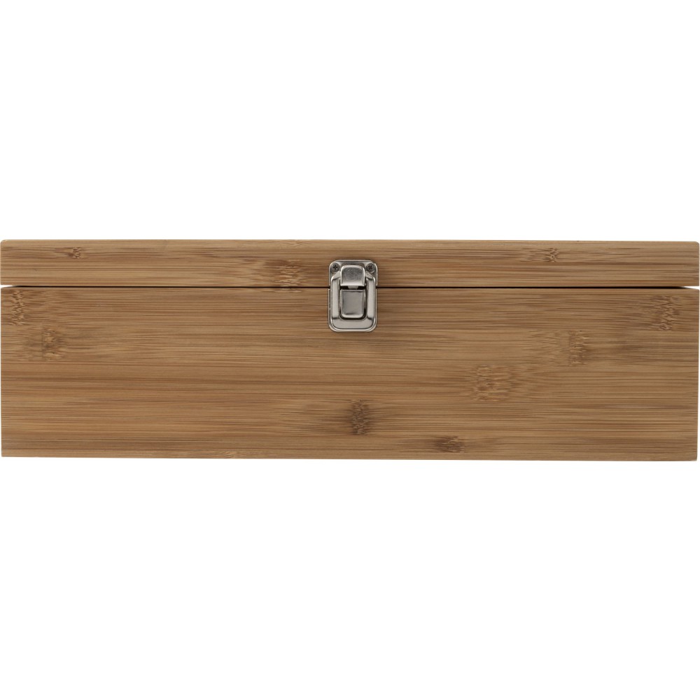 Boros ajándékkészlet bambusz dobozban. A tárgyak rozsdamentes acélból készültek bambusz részekkel. A készlet tartalma: cseppfogó, kiöntő, üvegdugó és pincérbicska. Bambusz és BPA-mentes műanyag.