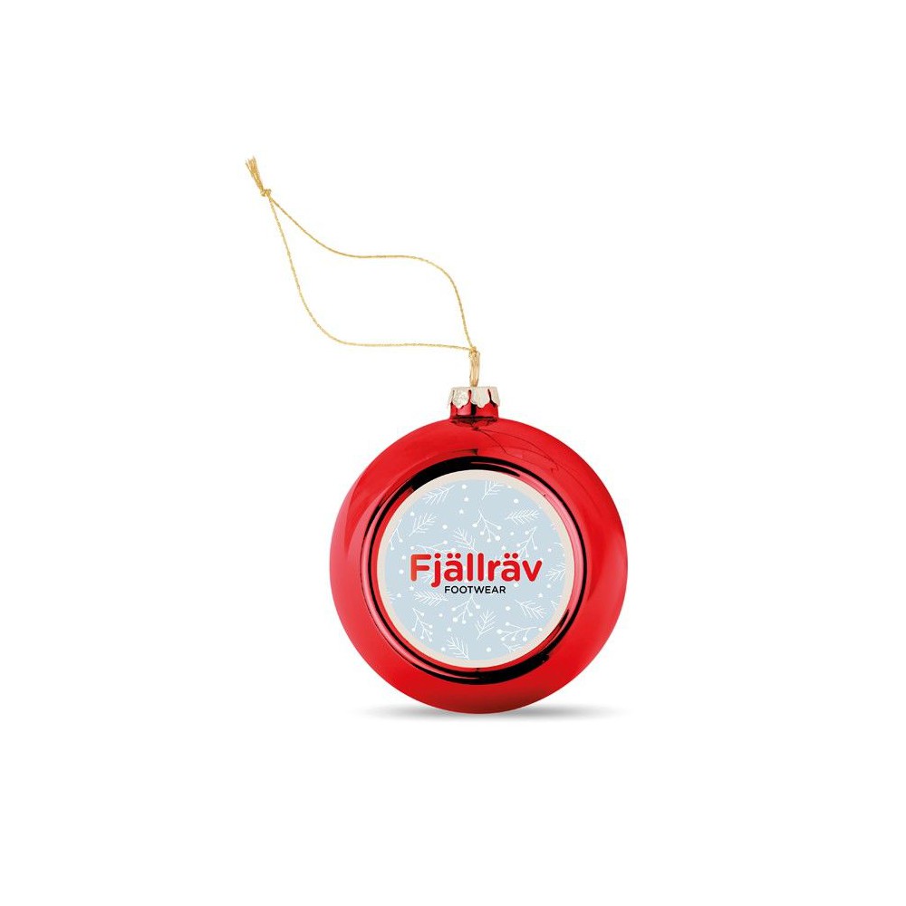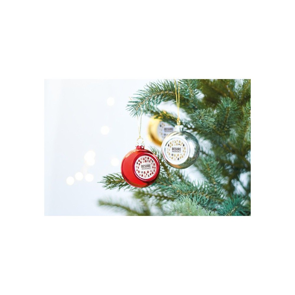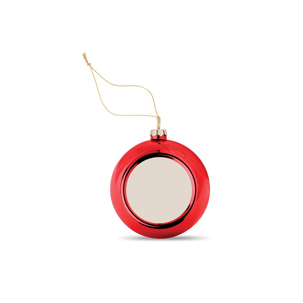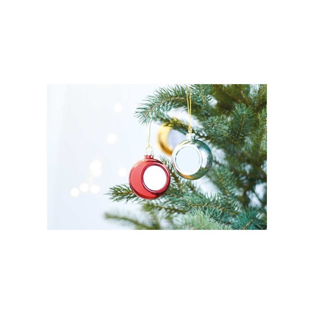 Karácsonyi gömbdísz fényes PP műanyagból, szublimációs nyomtatásra alkalmas táblával. 6 cm átmérő.