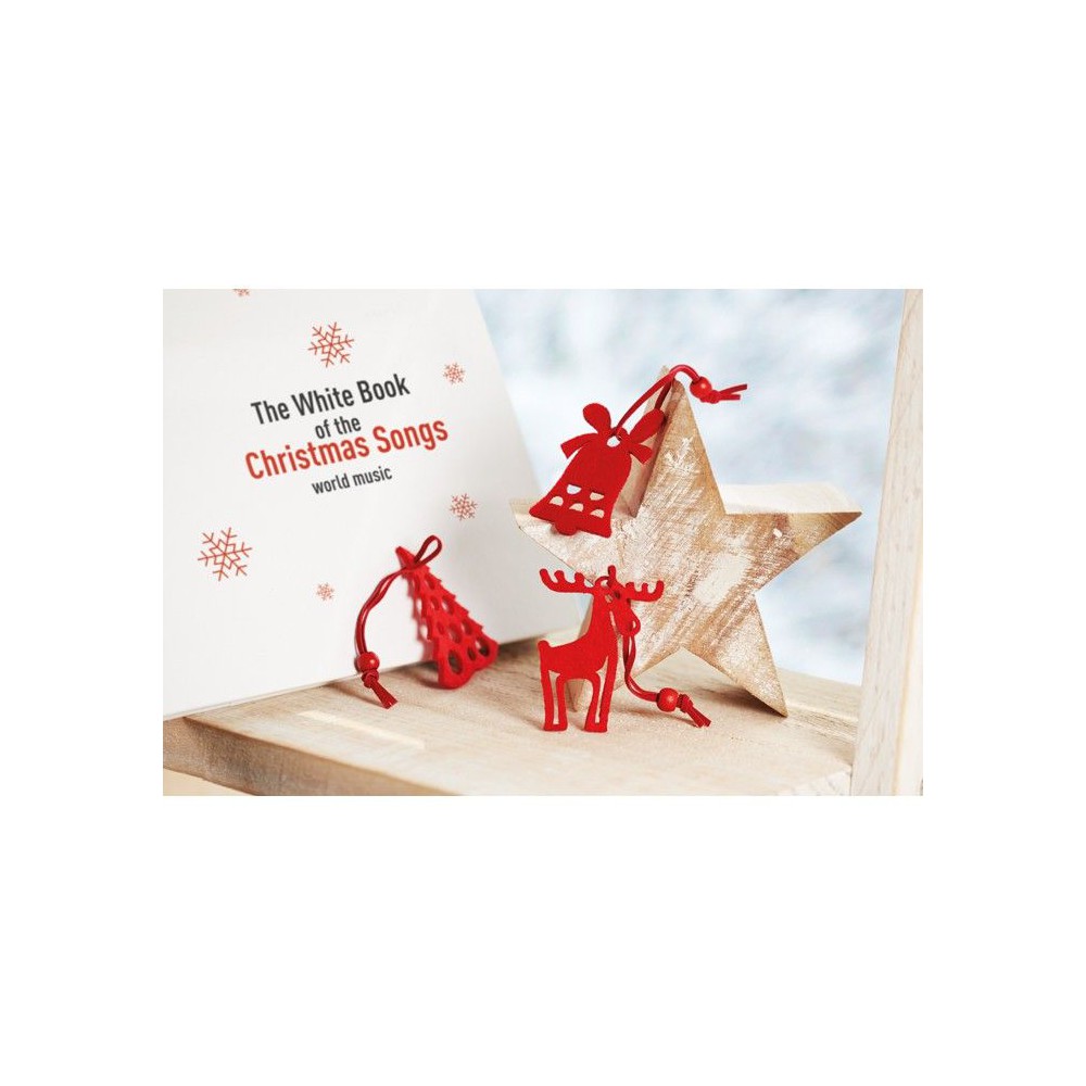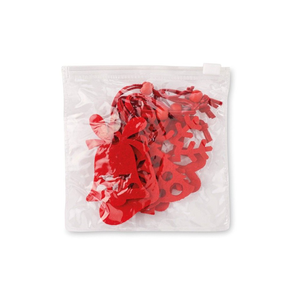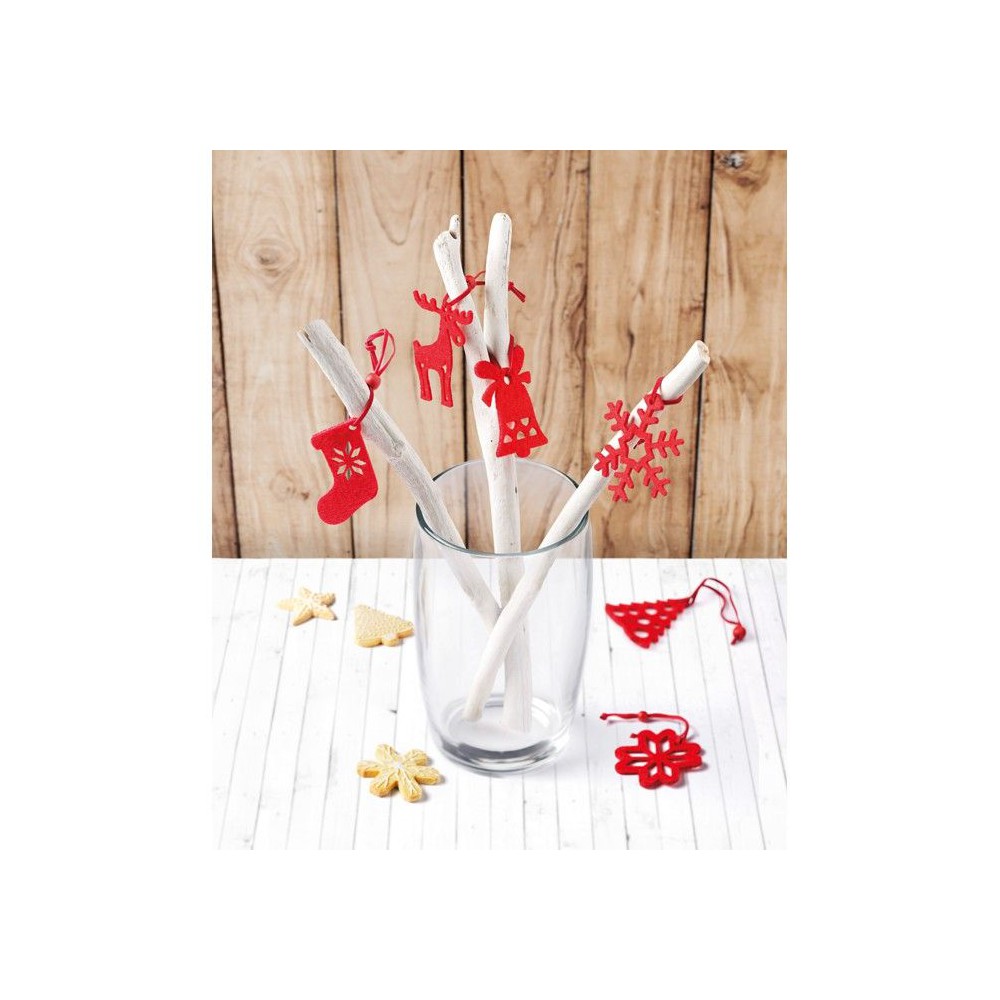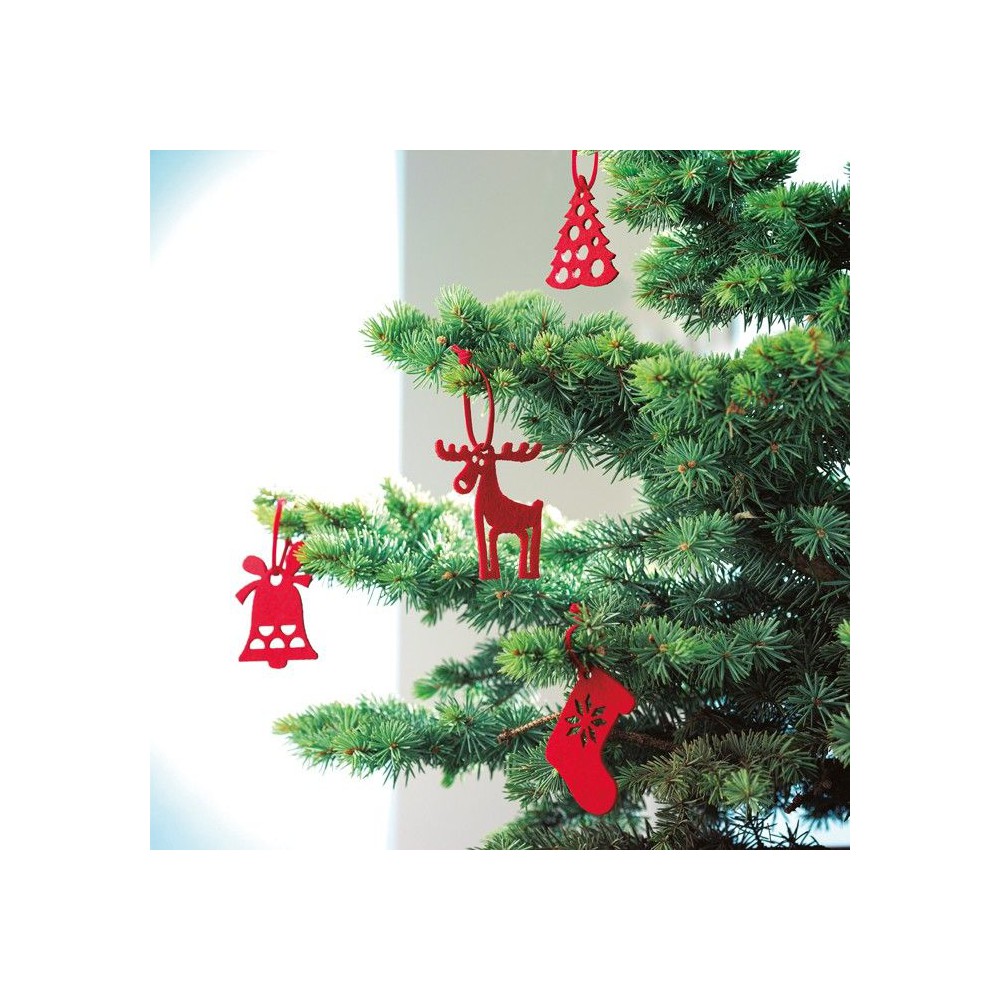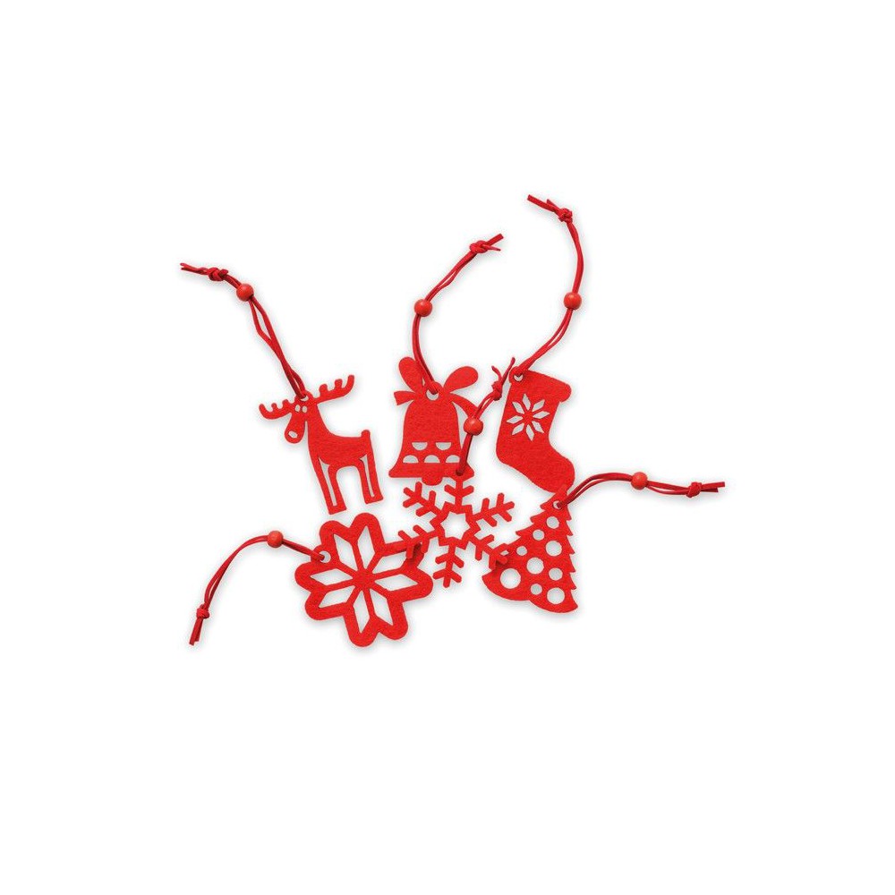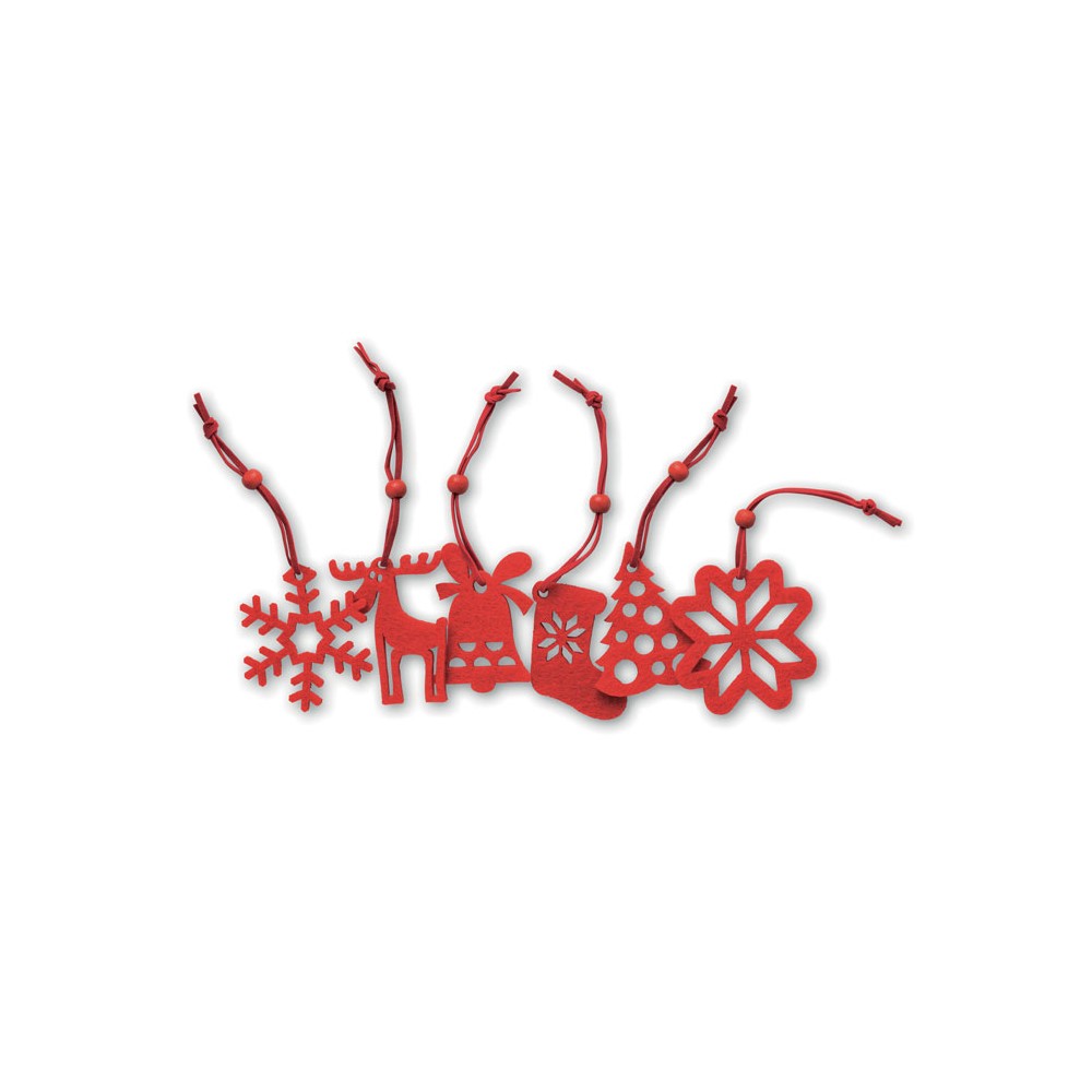 6 db különböző formájú piros karácsonyfadísz filc anyagból: fenyőfa, hópehely, harang, csizma, mikulásvirág és rénszarvas.
