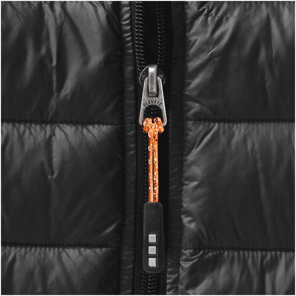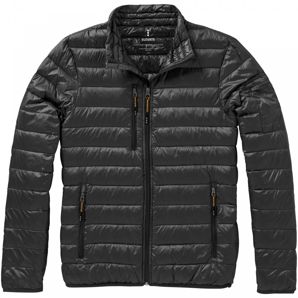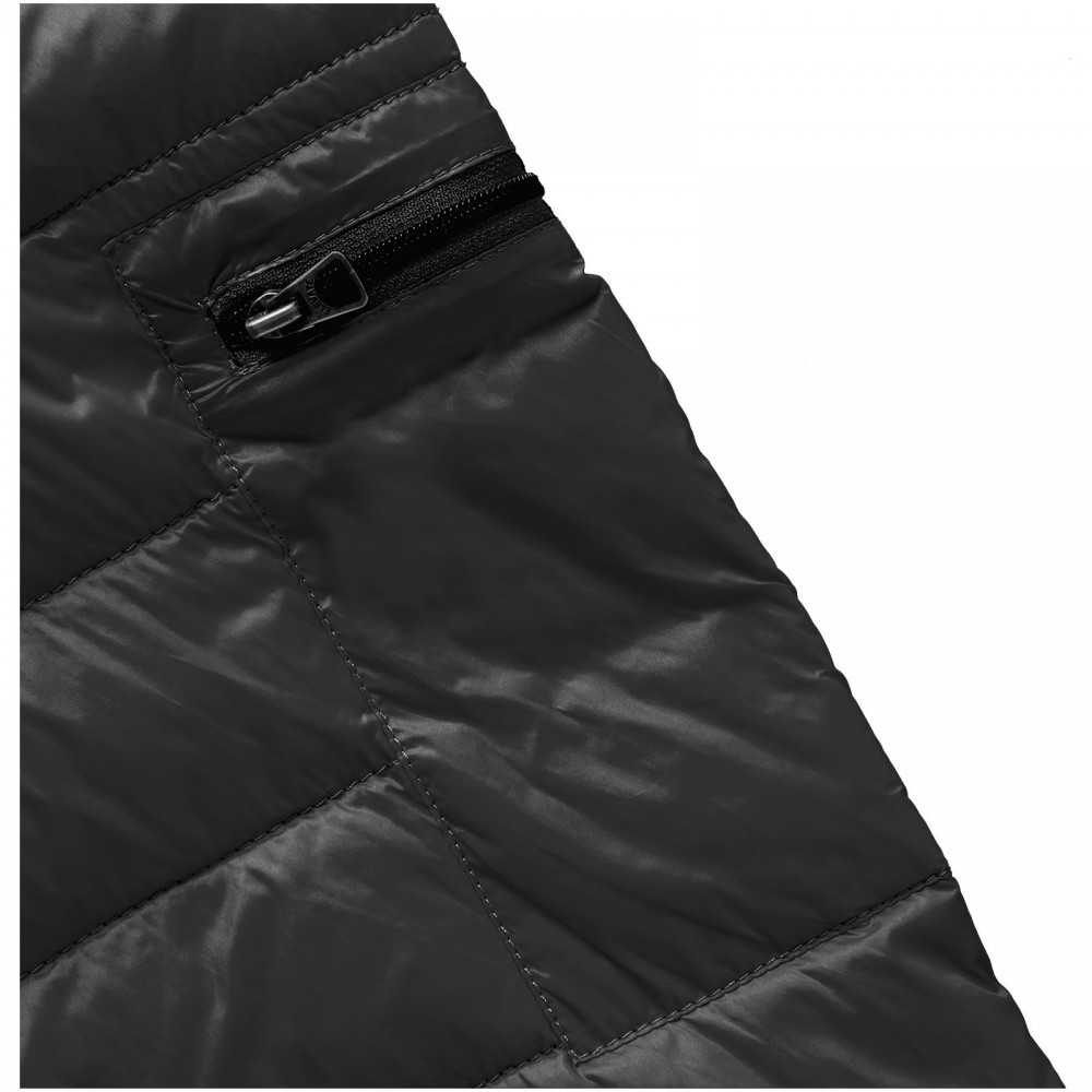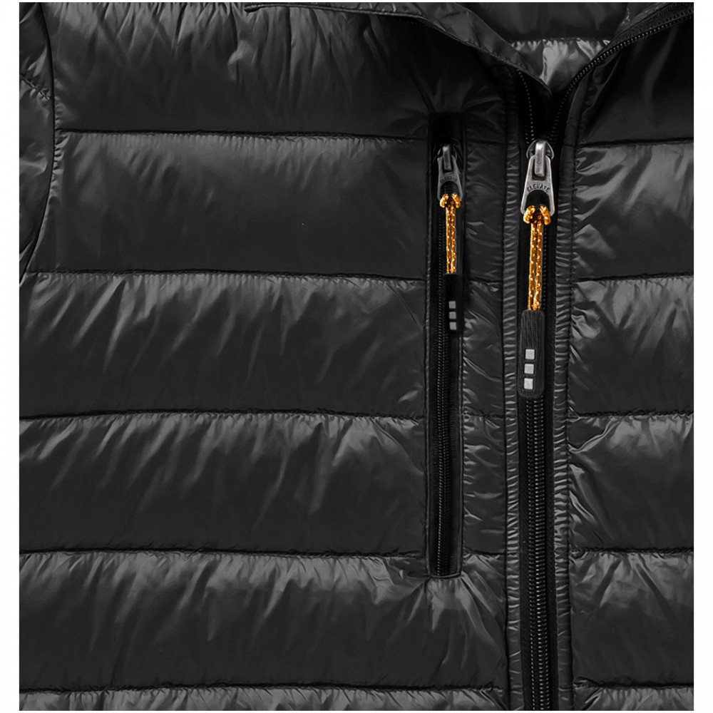 Normál szabásvonal. Pehelybiztos anyag. Cipzáros mell- és oldalzsebek. Emblémázásra alkalmas, cipzáros karzseb. Gumis szegély az aljon és a karöltőben. Könnyen megfogható cipzárhúzókák . Szél elleni állvédő betét a nyaknál. Vízlepergető, lélegző és szélálló. Hátul fényvisszaverő logónyomat . Könnyű, szigetelt pehelydzseki. 100% nylon, szőtt anyag, dupla vízlepergető bevonat, 20D. 80% pehely és 20% toll töltet. 115 g/m2
