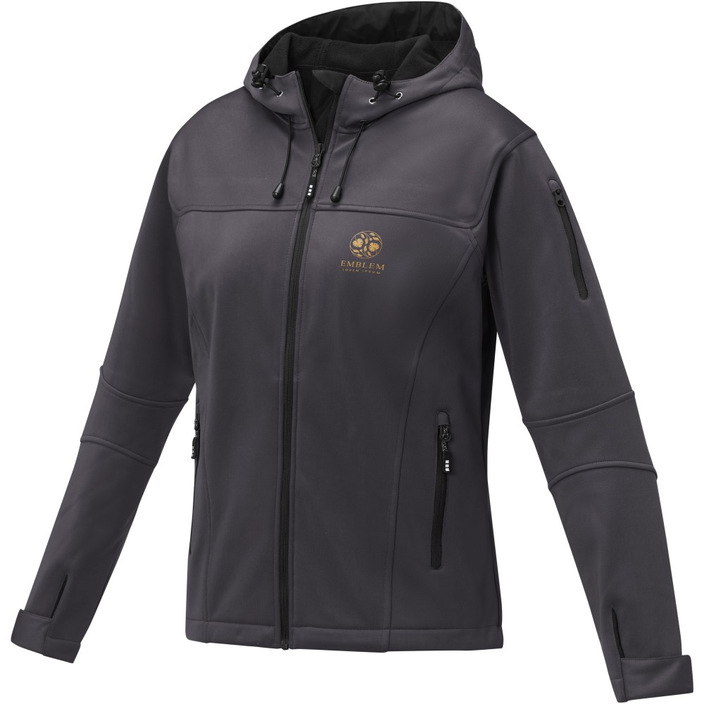 Női softshell dzseki. 3000 mm vízálló és 3000 g/m2 légáteresztő. Háromrétegű ragasztás: Jersey, TPU, polár. Elasztikus húzózsinór megállítóval. Állítható mandzsetta tépőzárral. Elülső zsebek cipzárral. Ujjzseb cipzárral. Középen elöl kontrasztos fordított cipzár. Single Jersey kötött 90% poliészterből és 10% elasztánból, 360 g/m2, mikropolár 100% poliészterből.