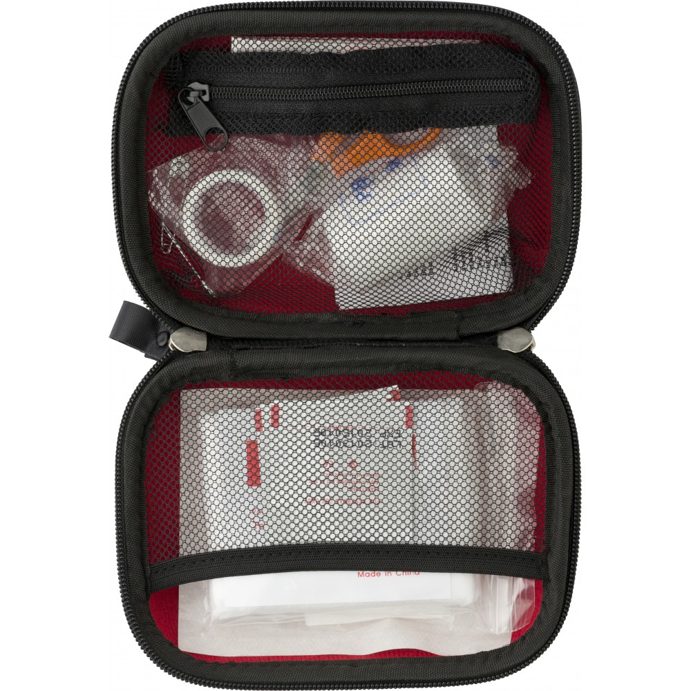 Elsősegélykészlet piros tokban. Tartalma: steril lap, ragtapaszok, biztosítótű, olló, 4 db alkoholos lap, 5 db steril ragtapasz stb.