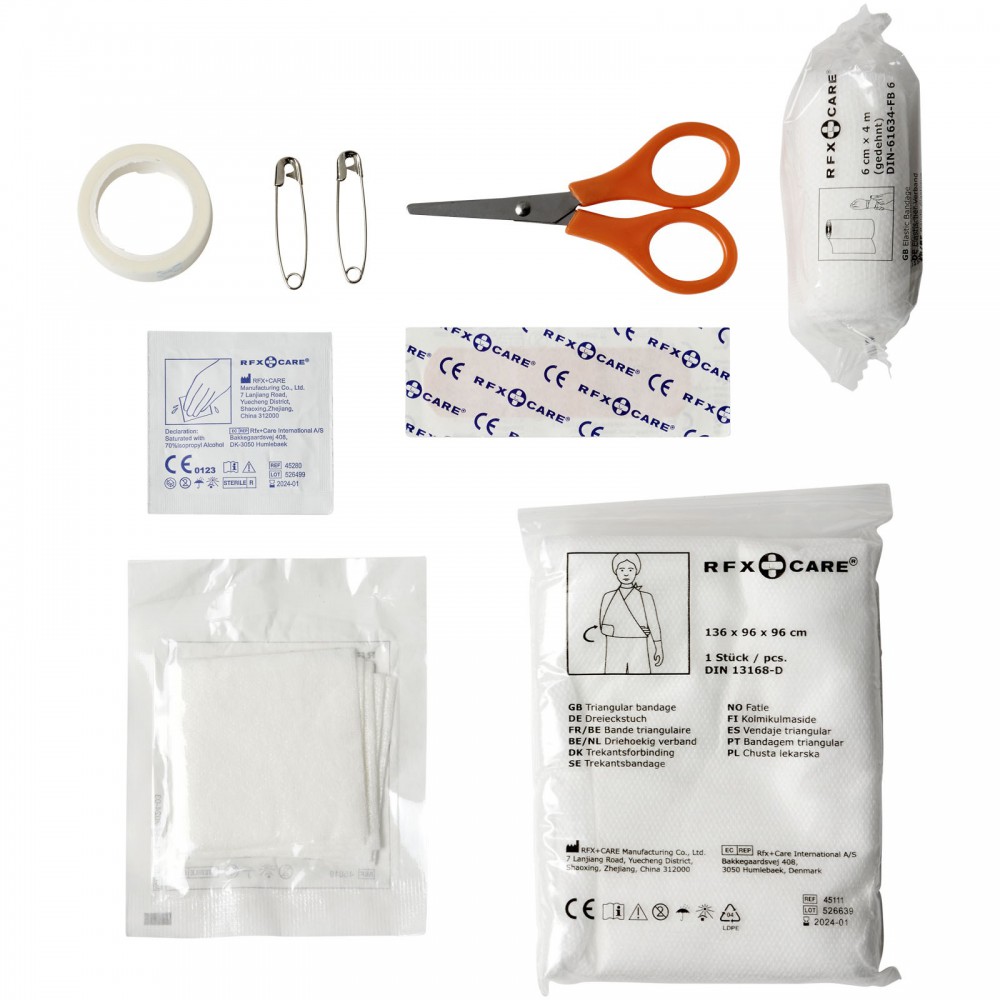 16 db-os készlet. Az EVA tasakban 4 alkoholos párna, 1 préselt szivacs, 5 ragtapasz, 1 papírtapasz, 1 kötszer, olló, 2 tű és 1 háromszög kötszer. EN13485 szabványnak megfelelő.