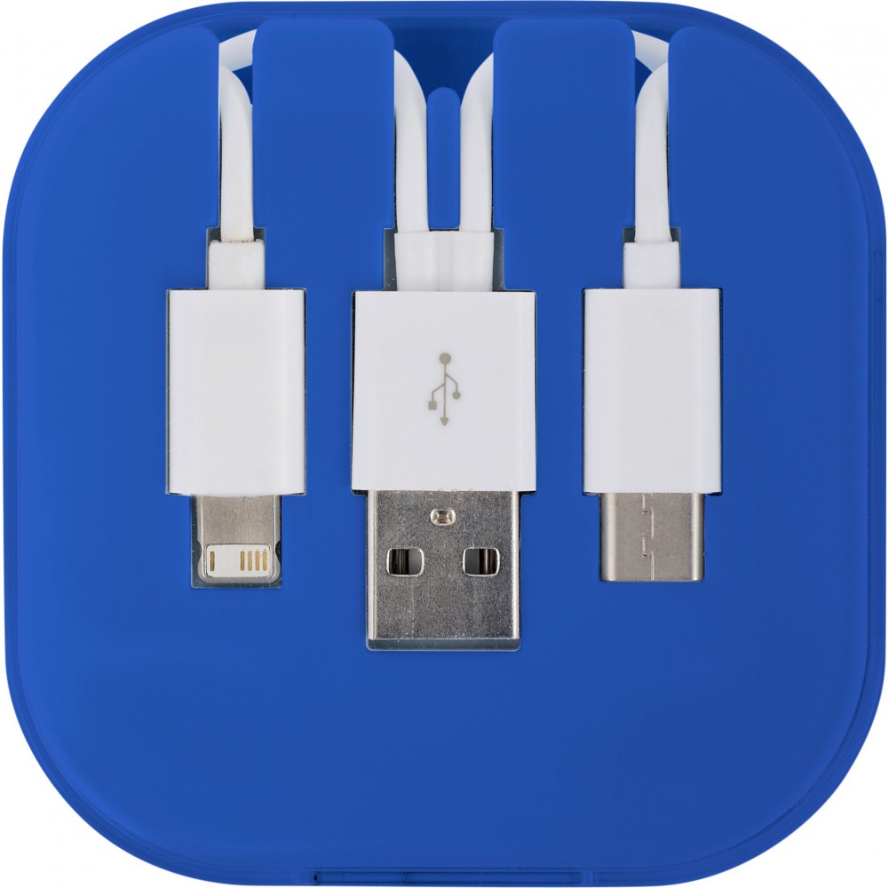USB töltőkábel műanyag tokban. USB, USB-C és micro USB csatlakozóval rendelkezik. A micro USB csatlakozó átváltható Lightning csatlakozóra. A kábel hossza: kb. 24 cm. ABS, PVC, PS műanyag.