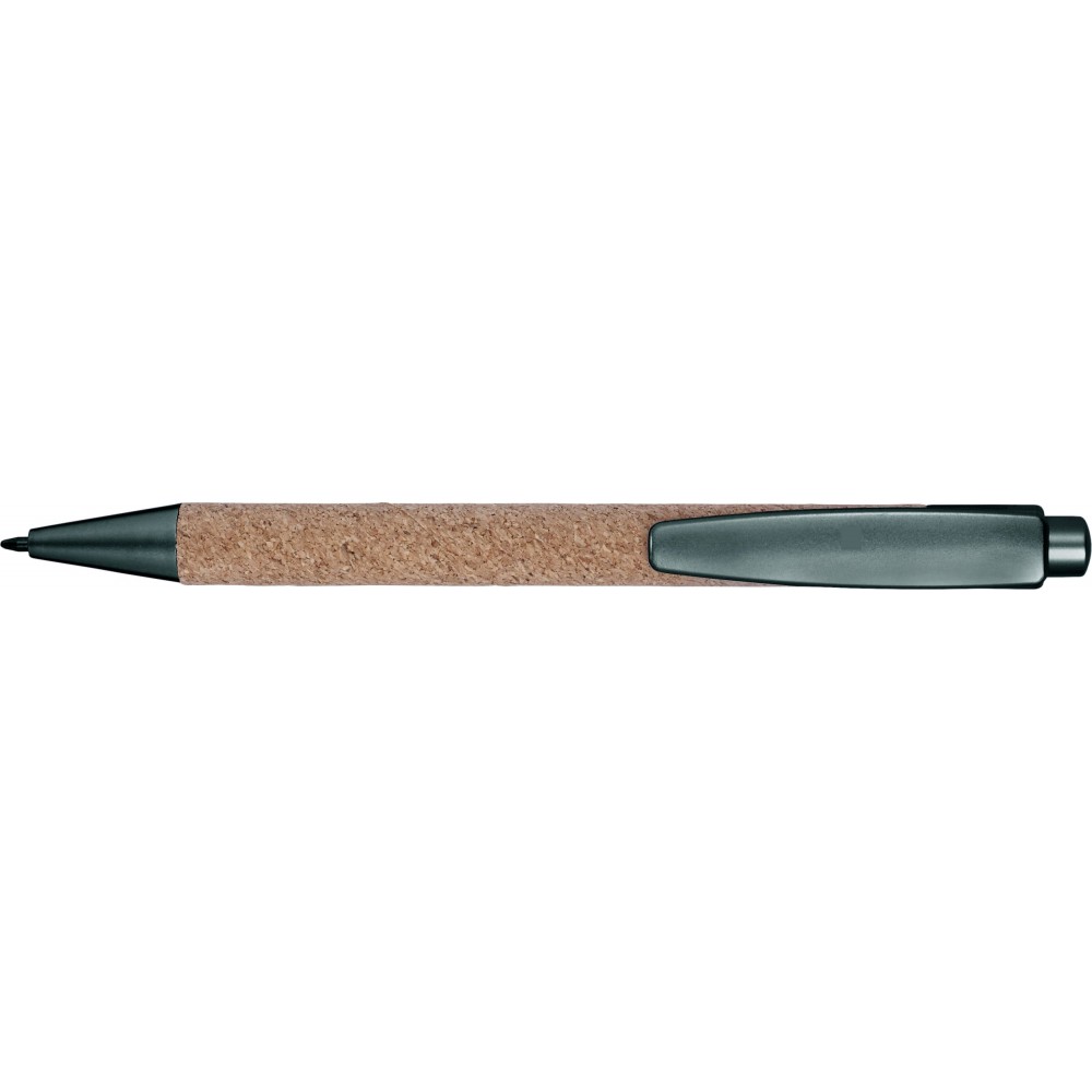 Golyóstoll parafa tolltesttel és műanyag véggel, klipsszel és nyomógombbal. Kék tollbetéttel. ABS, parafa.