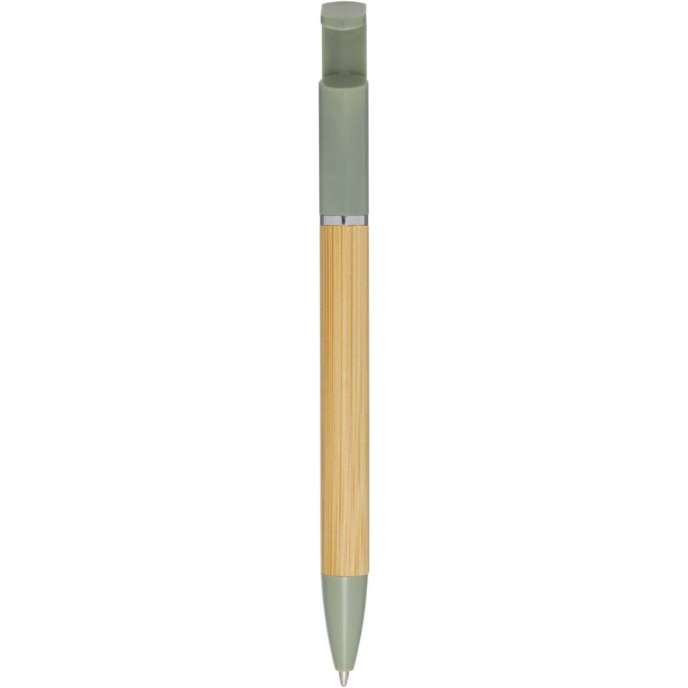 Bambusz golyóstoll, amely telefontartóként is funkcionál. A gomb és a középső gyűrű újrahasznosított műanyagból, a hegy rézből, a tollteste pedig felelősen beszerzett bambuszból készült. Fekete tollbetéttel. Írási hossz: 1000 méter. Tollhegy mérete: 1,0 mm.