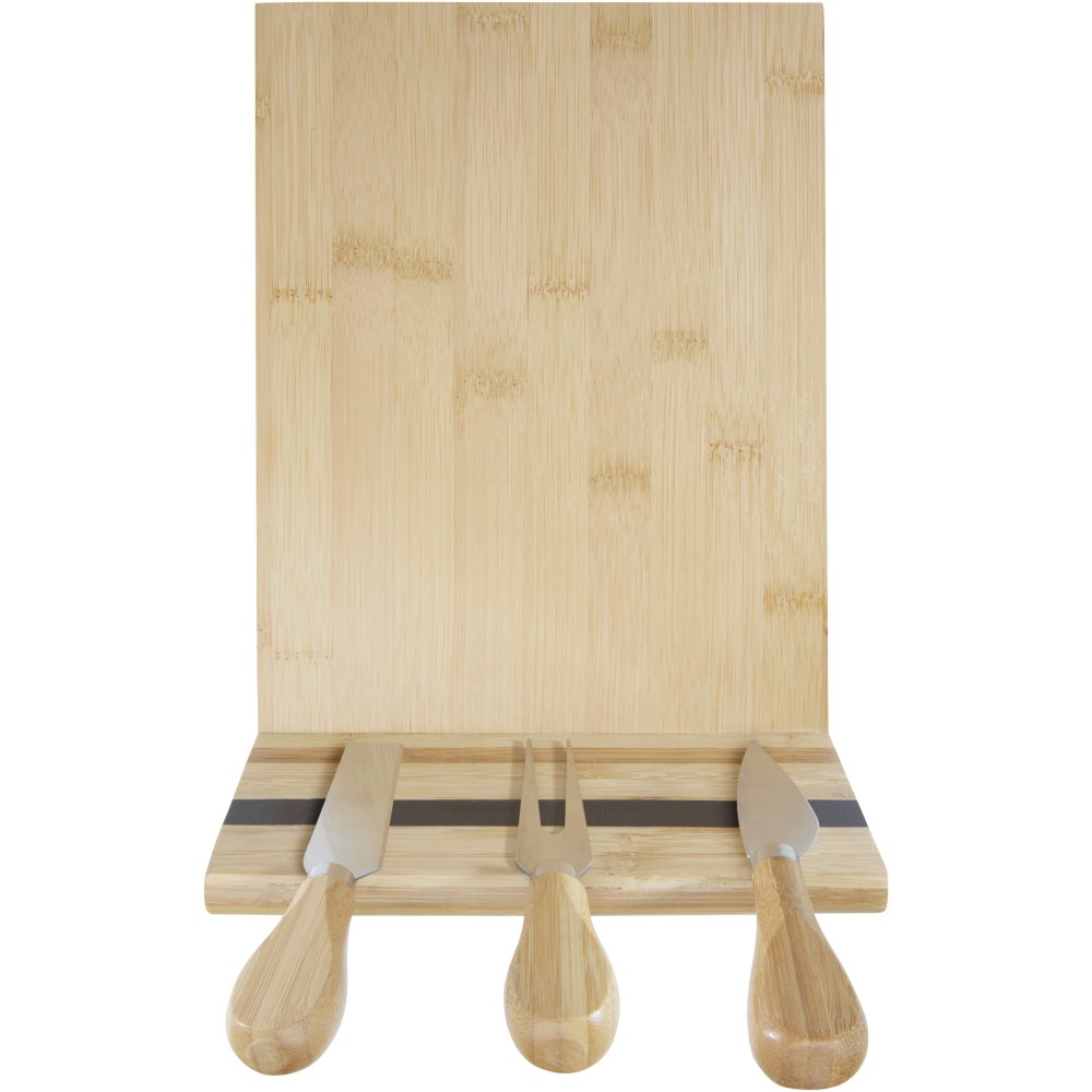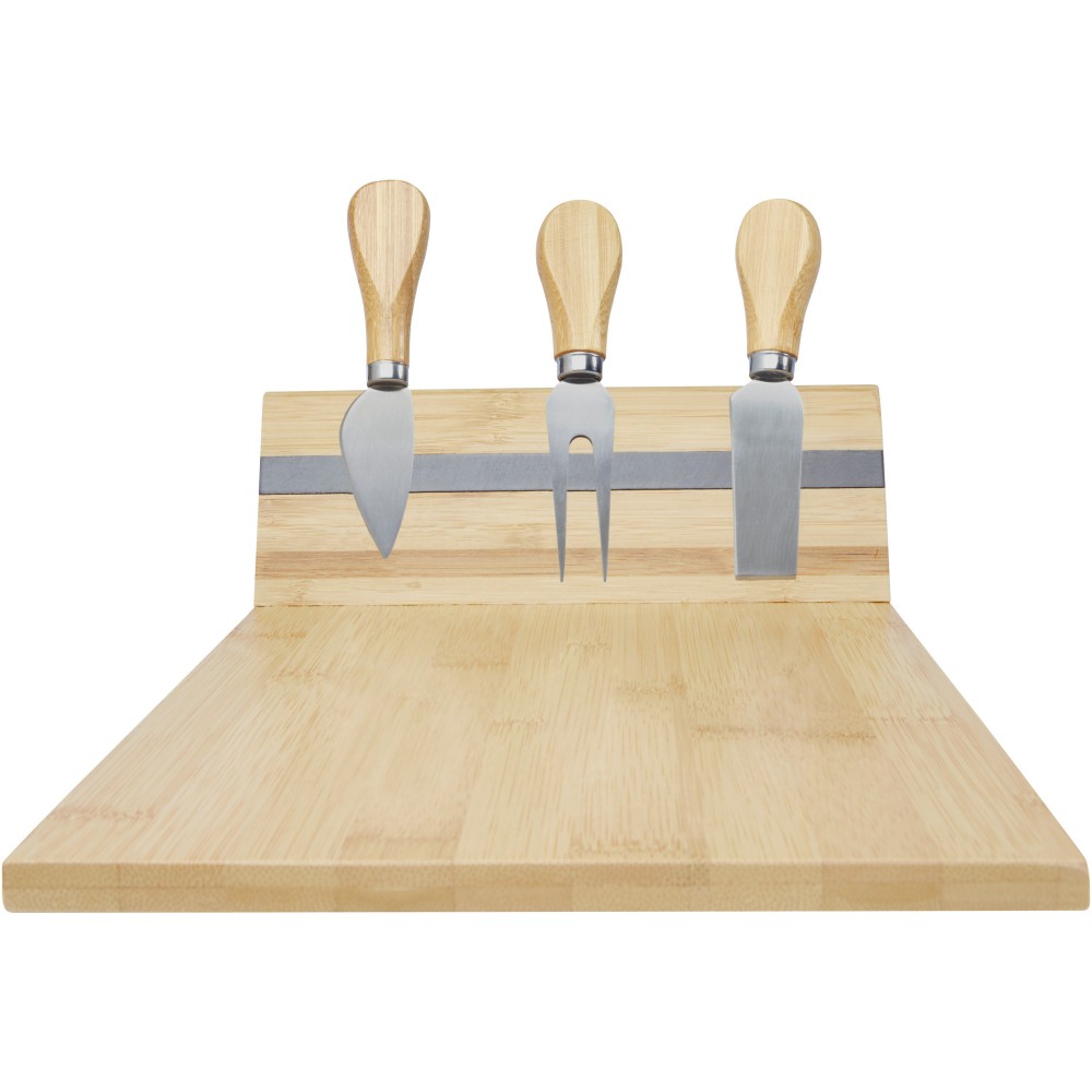 Sajtkészlet bambusz sajtvágó deszkával, (30 x 20,2 x 7,6 cm), 2 sajtkéssel (12,5 x 2,5 cm és 12,5 x 2,7 cm), sajtvillával (13,5 x 2,4 cm). A deszka oldalán egy mágnescsík található az eszközök rögzítéséhez, így stílusosan tálalhatja fel a sajtokat. A felhasznált bambusz forrása és előállítása a fenntartható szabványok szerint történik.