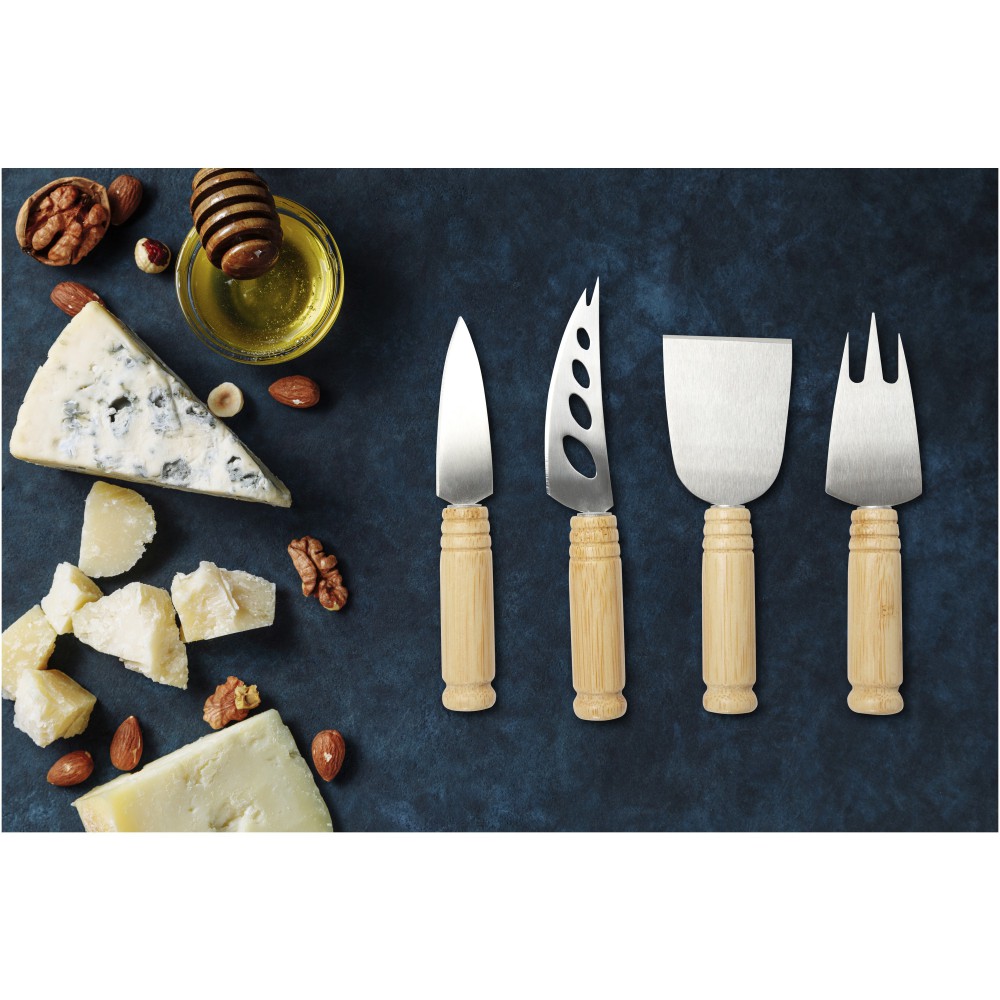 4 részes bambusz sajtkészlet, egy sajtlapáttal (13,3 x 4,7 cm), 2 sajtkéssel (13,5 x 2 cm és 15,3 x 2,5 cm) és egy sajtvillával (14 x 3,5 cm). Az ergonomikus fogantyú kialakítása, a jó méret és a kerek fogantyú megkönnyíti a fogást. Az összes szerszám fogantyúi 7 cm hosszúak, átmérője 1,9 cm. Különböző kemény és lágy sajtok feltekerésére, vágására, szeletelésére, vékony lapok reszelésére és kenésére tervezték. Könnyűek és helytakarékosak, könnyen tárolhatók a konyhaszekrényben, tökéletesek tálcákhoz vagy étkezőasztalokhoz. A felhasznált bambusz forrása és előállítása a fenntartható szabványok szerint történik.