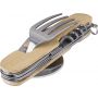 Többfunkciós evőeszköz bambusz nyéllel. Az eszköz szétszedhető a kétkezes étkezés érdekében. Csomagolása barna papírdoboz.