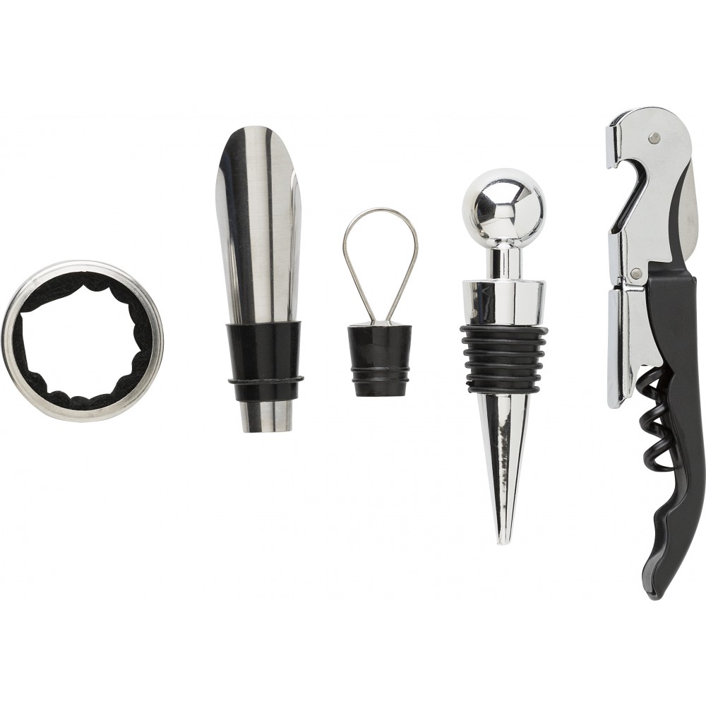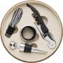 Parafa tartó 4 darabos boroskészletnek. Tartalma: pincérbicska, üvegdugó, cseppfogó, kiöntő. Csomagolása kraft papírdoboz.