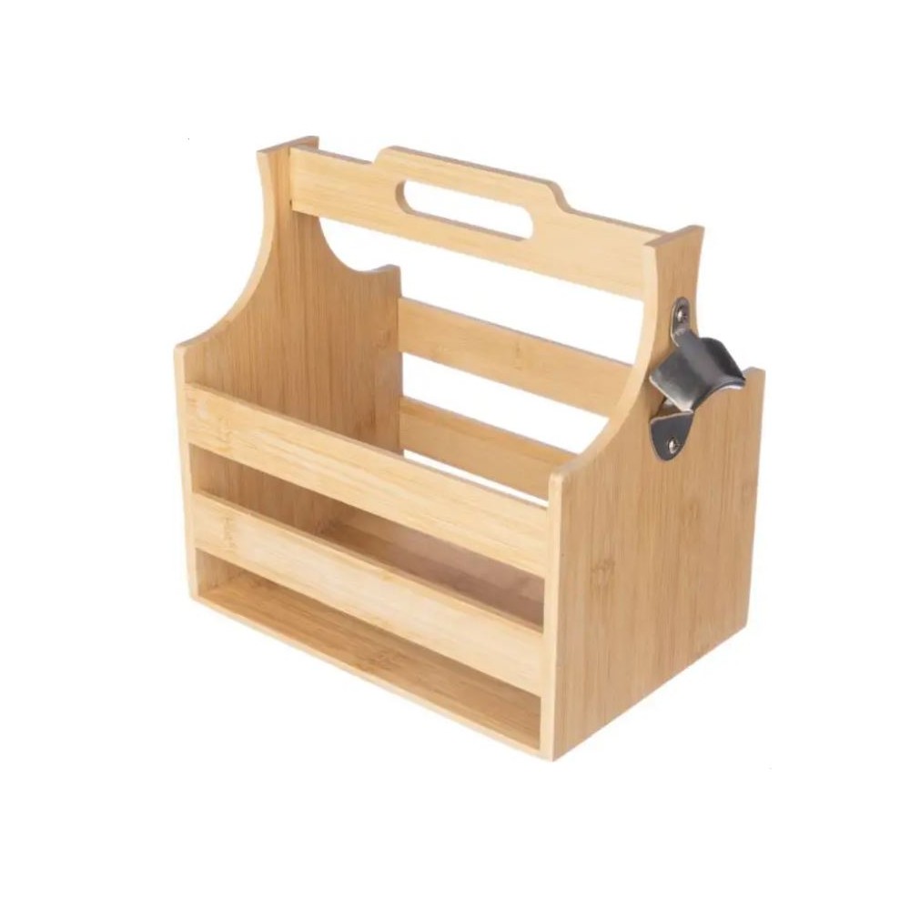 Bambusz palacktartó rekesz sörösüvegek számára, oldalán fém sörnyitóval. Barna kartondobozba egyedileg csomagolva érkezik.