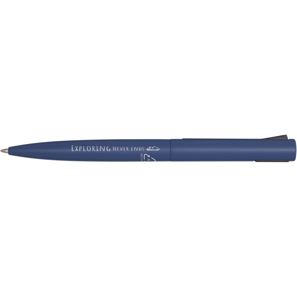 Golyóstoll, melynek felső teste újrahasznosított műanyagból, alsó része pedig újrahasznosított alumíniumból készült. A klipsz vasból készült. Kék tollbetéttel. Írási hossz: 1000 méter. Hegyméret: 1,0 mm.