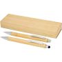 Golyóstoll újrahasznosított alumíniumból, gumírozott bevonattal, bambusz nyomógombbal és bambusz gyűrűvel a tolltesten. Kék tollbetéttel. A tollhegy vastagsága 1.0 mm, íráshossz: kb. 800 méter. Az újrahasznosított anyagra utaló logó a tollra van gravírozva.