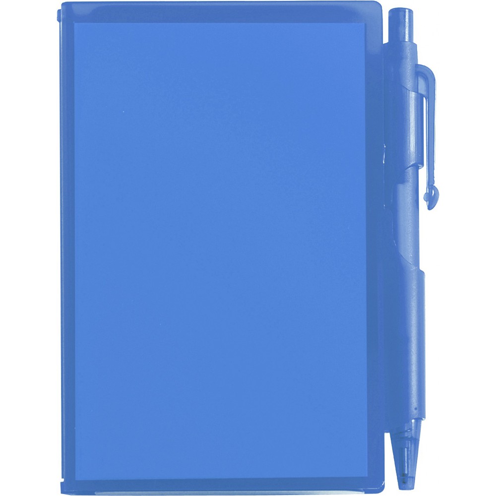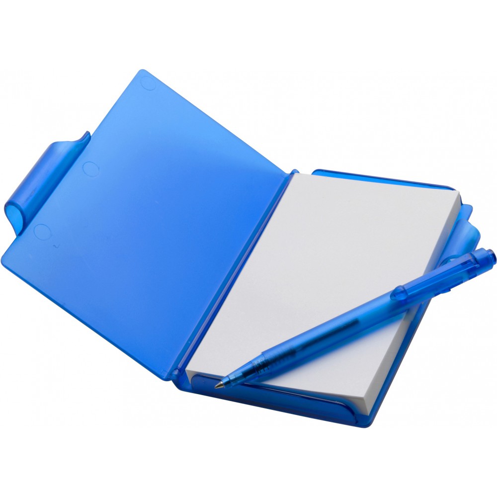 Jegyzettömb műanyag tokban (kb. 100 lapos) és golyóstoll fekete tollbetéttel.