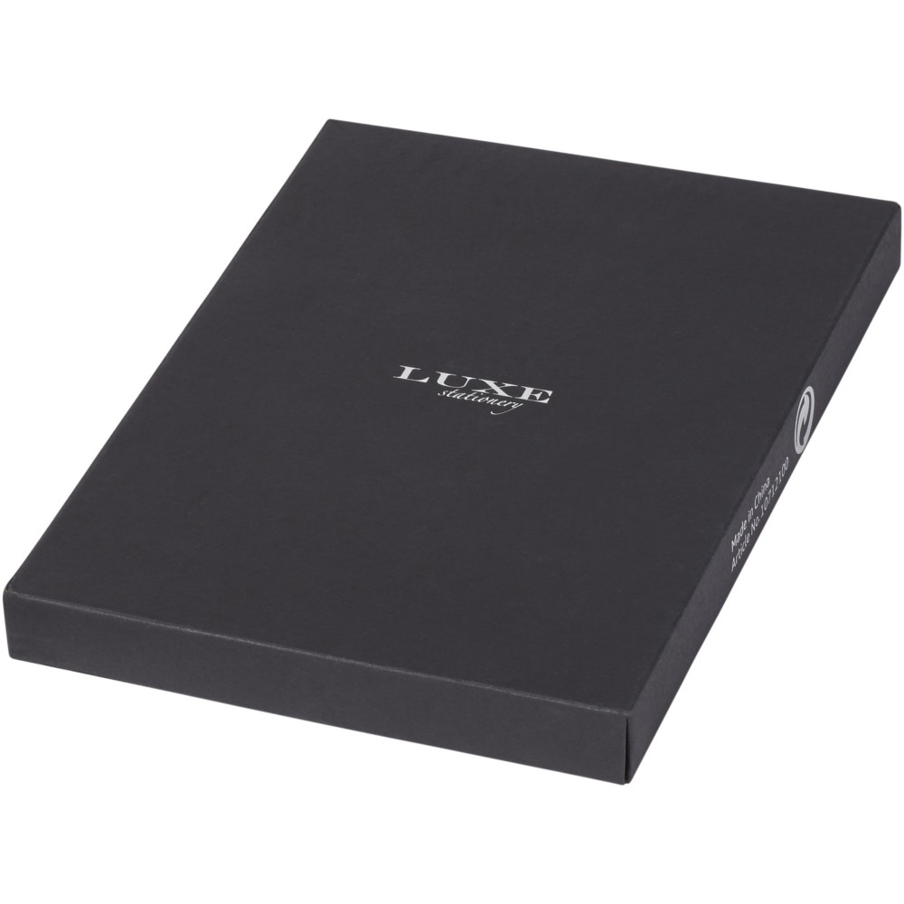 Kiválóan kialakított A5 méretű füzet, 80 db krémszínű vonalas lappal, belső merevítő lappal és tollhurokkal. Csomagolása Luxe ajándékdoboz. Műbőr.