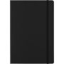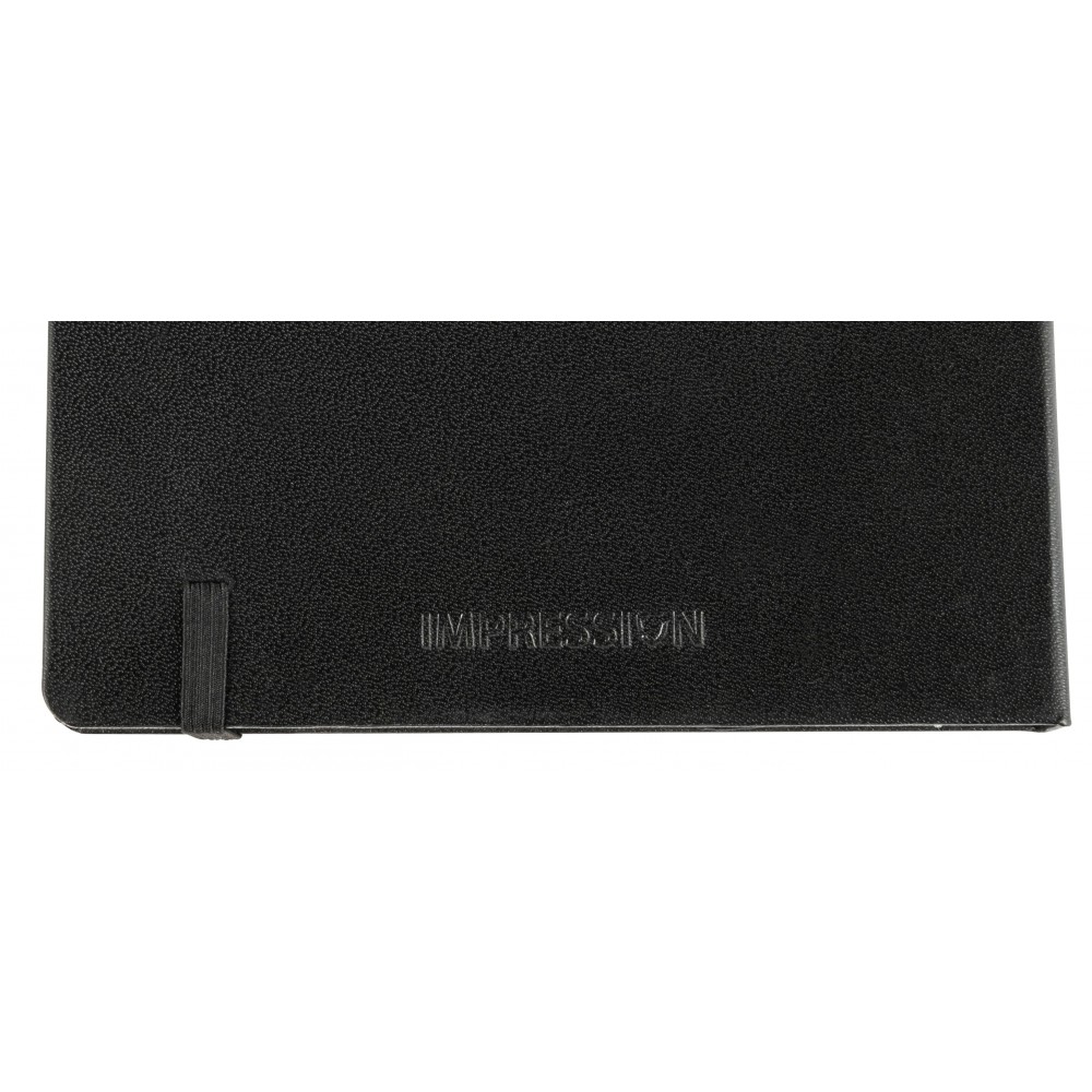 A5-ös füzet gumis záródással, 128 vonalas, dátumjelzéses lappal és papírzsebbel a hátsó, belső borítón. A külső hátsó borítón IMPRESSION logó található. PVC, 80 g papír.
