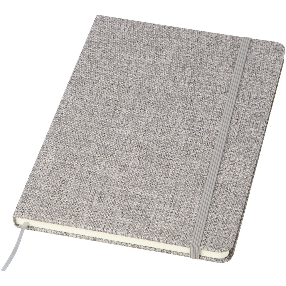 Kemény fedeles A5 jegyzetfüzet újrahasznosított pamutból, 80 soros 70 g/m2 papírral. A jegyzetfüzet gumis záródással, szalaggal és lekerekített sarkokkal rendelkezik.