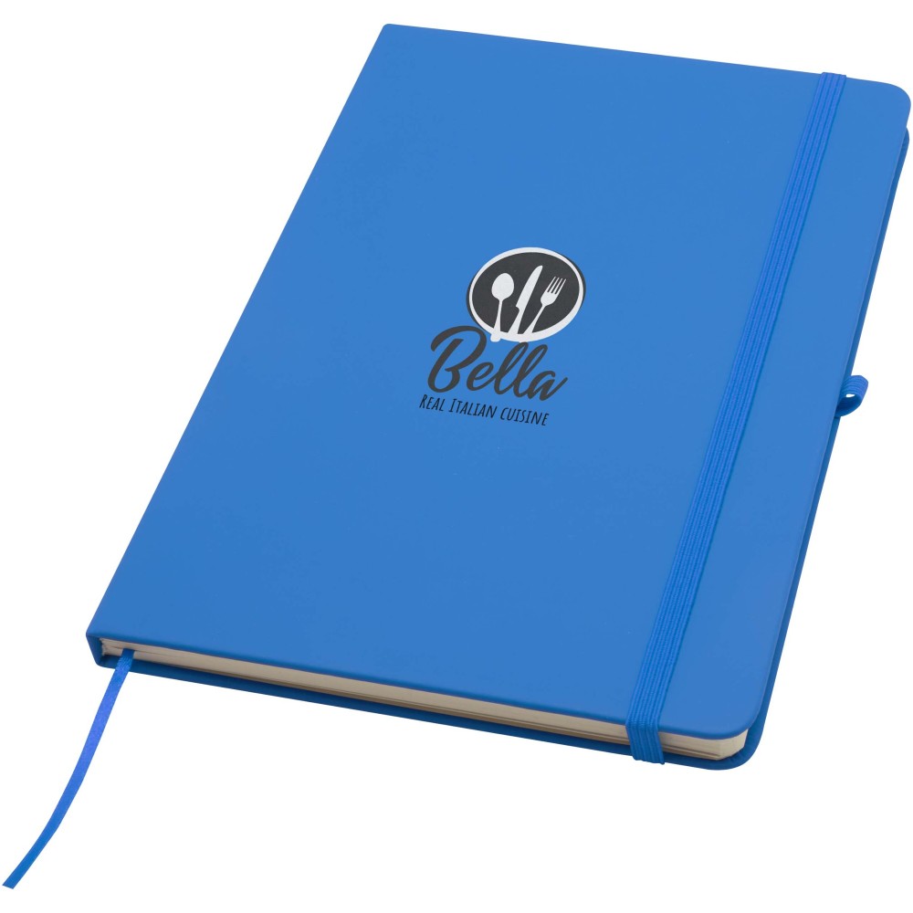 A Spectrum Plus A5 keményfedeles jegyzetfüzet lekerekített sarkokkal nemcsak az irodai mindennapok elengedhetetlen kelléke, hanem remek lehetőség márkád népszerűsítésére is. A jegyzetfüzet puha tapintású borítóval rendelkezik és 80 vonalas, krémszínű, 70 g/m2-es lapból áll, amely tökéletes gyors ötletek vagy hosszabb jegyzetek rögzítésére. A jegyzetfüzet tolltartó hurokkal, gumiszalagos záródással, könyvjelzővel és harmonikazsebbel van ellátva.