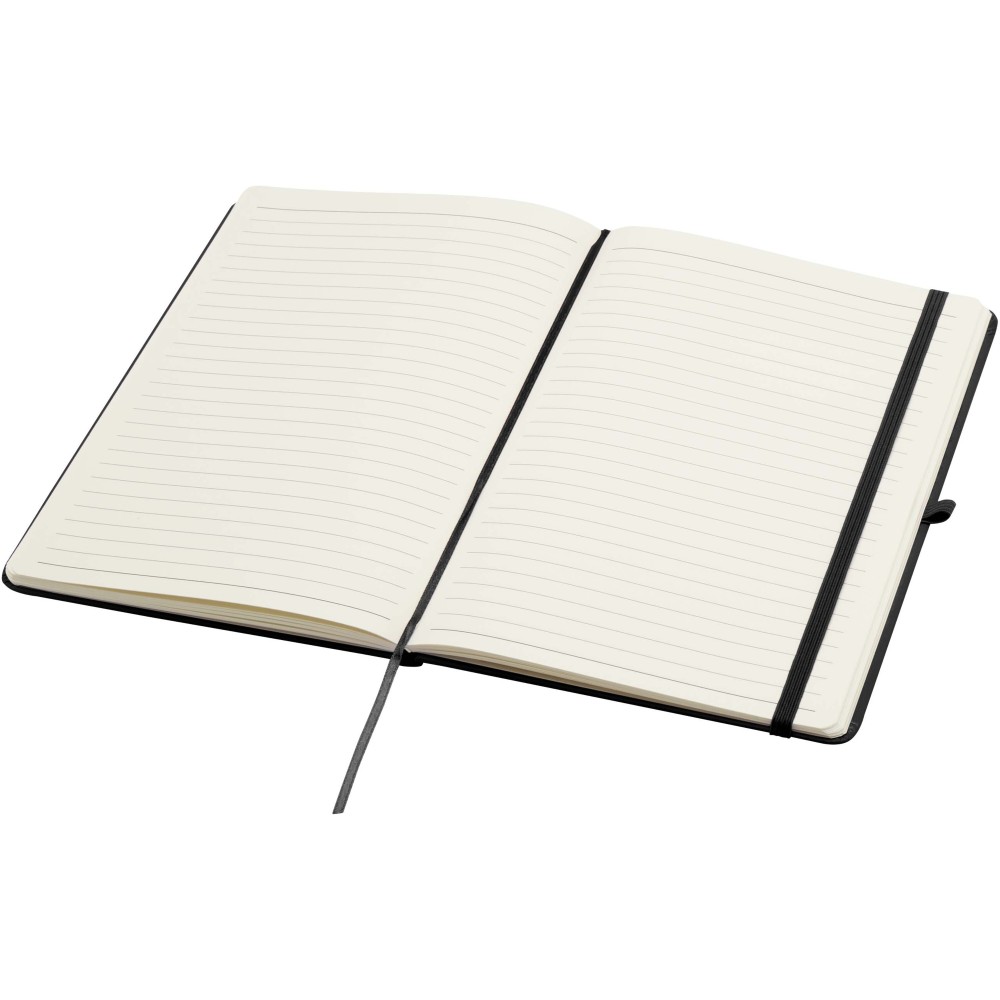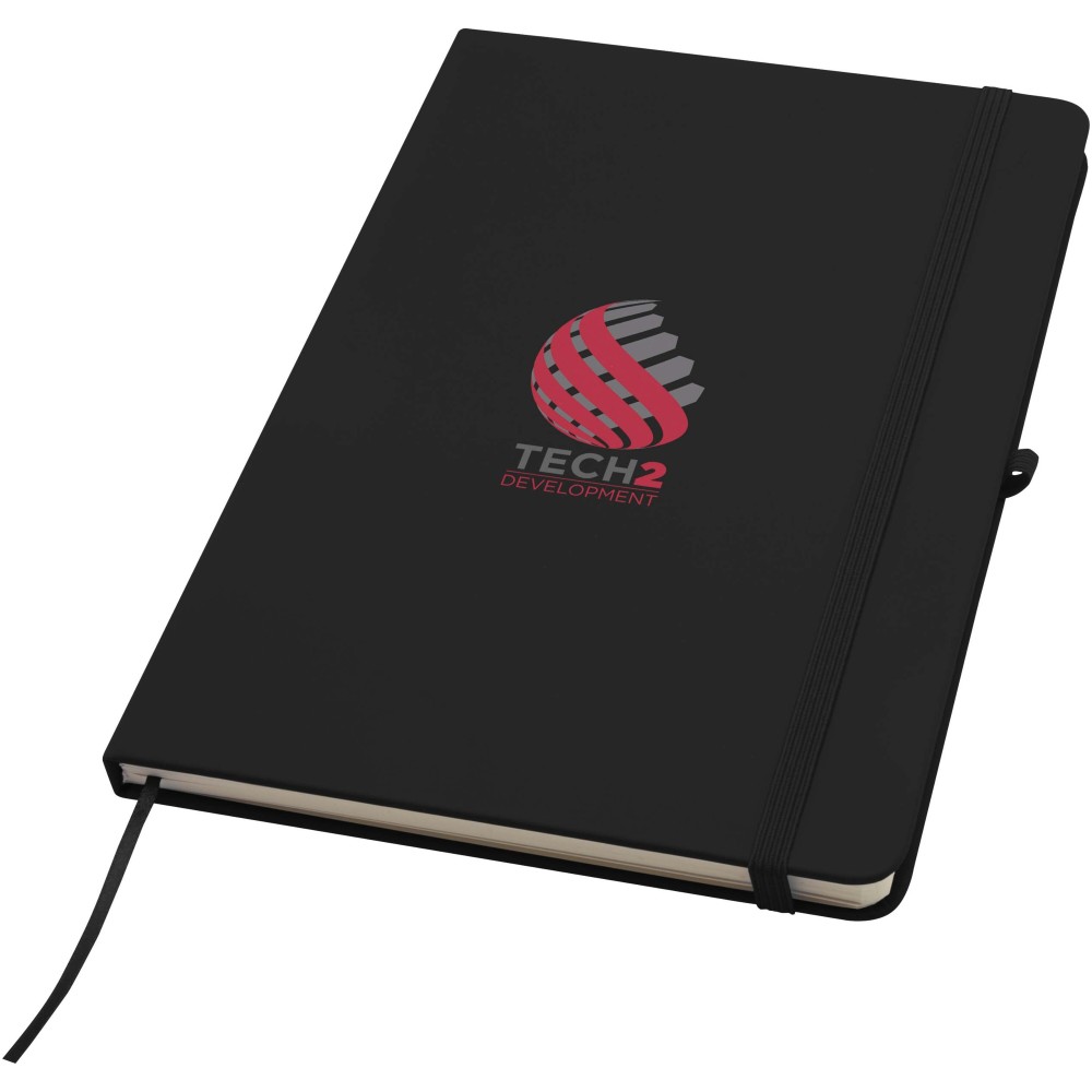 A Spectrum Plus A5 keményfedeles jegyzetfüzet lekerekített sarkokkal nemcsak az irodai mindennapok elengedhetetlen kelléke, hanem remek lehetőség márkád népszerűsítésére is. A jegyzetfüzet puha tapintású borítóval rendelkezik és 80 vonalas, krémszínű, 70 g/m2-es lapból áll, amely tökéletes gyors ötletek vagy hosszabb jegyzetek rögzítésére. A jegyzetfüzet tolltartó hurokkal, gumiszalagos záródással, könyvjelzővel és harmonikazsebbel van ellátva.