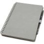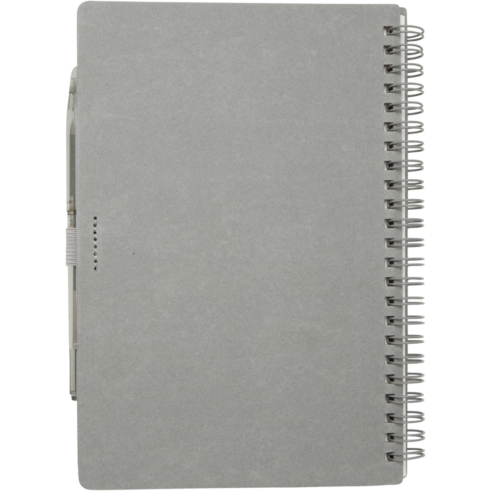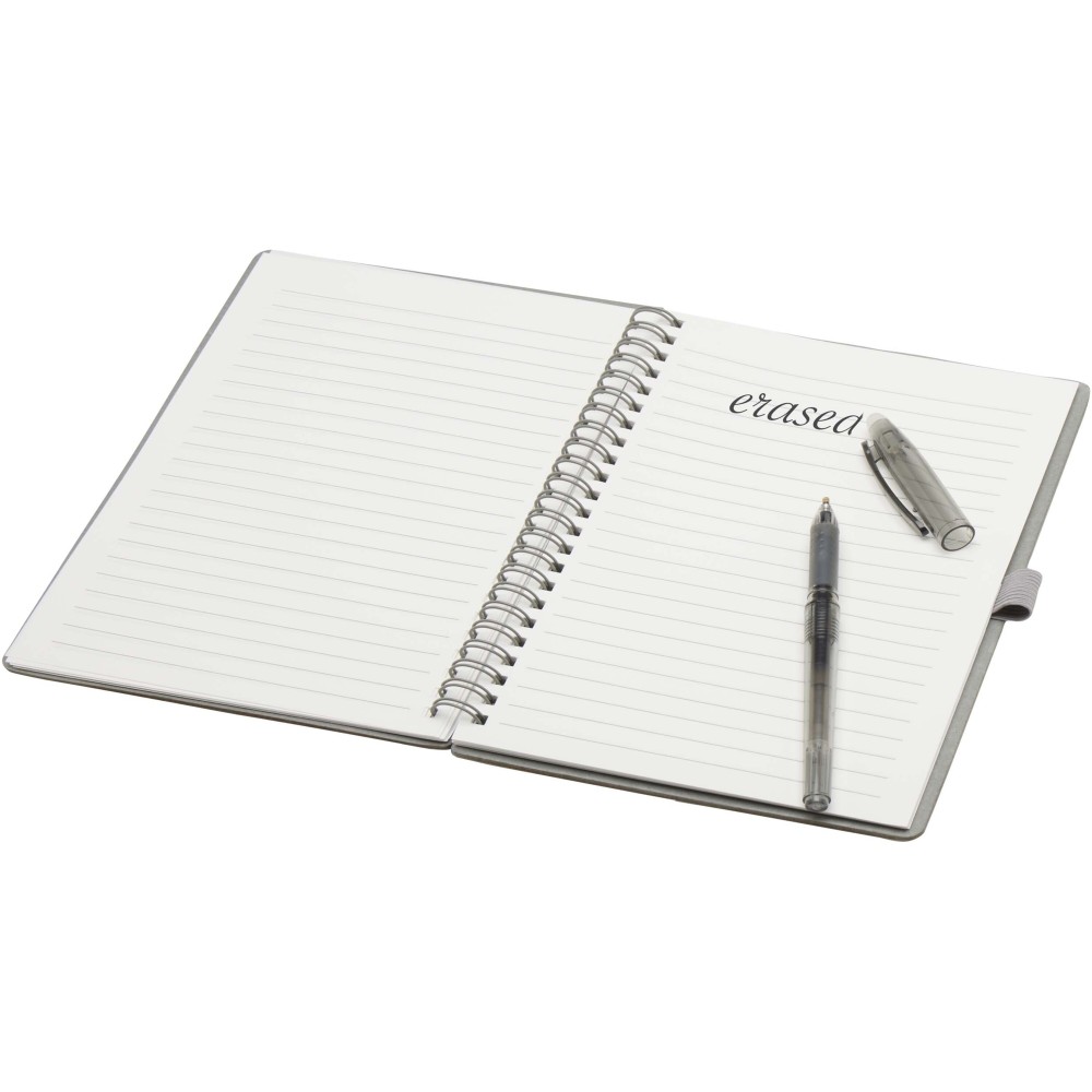 Újrahasználható, kőből készült kemény fedeles jegyzetfüzet és toll szett. A jegyzetfüzet borítója kartonból készült, lekerekített sarkokkal, és 32 lap 120 g/m2 súlyú vonalas kőpapír lapot tartalmaz. A kőpapír 100%-ban famentes, és előállítása kevesebb energiát igényel, mint az újrahasznosított vagy új cellulózpapíré. A jegyzetfüzet hátulján zseb található a mellékelt fekete törlőkendő tárolására. Tartozék továbbá egy újrahasznosított műanyagból készült törölhető toll átlátszó tolltesttel, fehér radírral a tetején, és színes, tömör fogórésszel. Tinta színe: fekete. Íráshossz: 250 méter. Tollhegy mérete: 0,7 mm.
