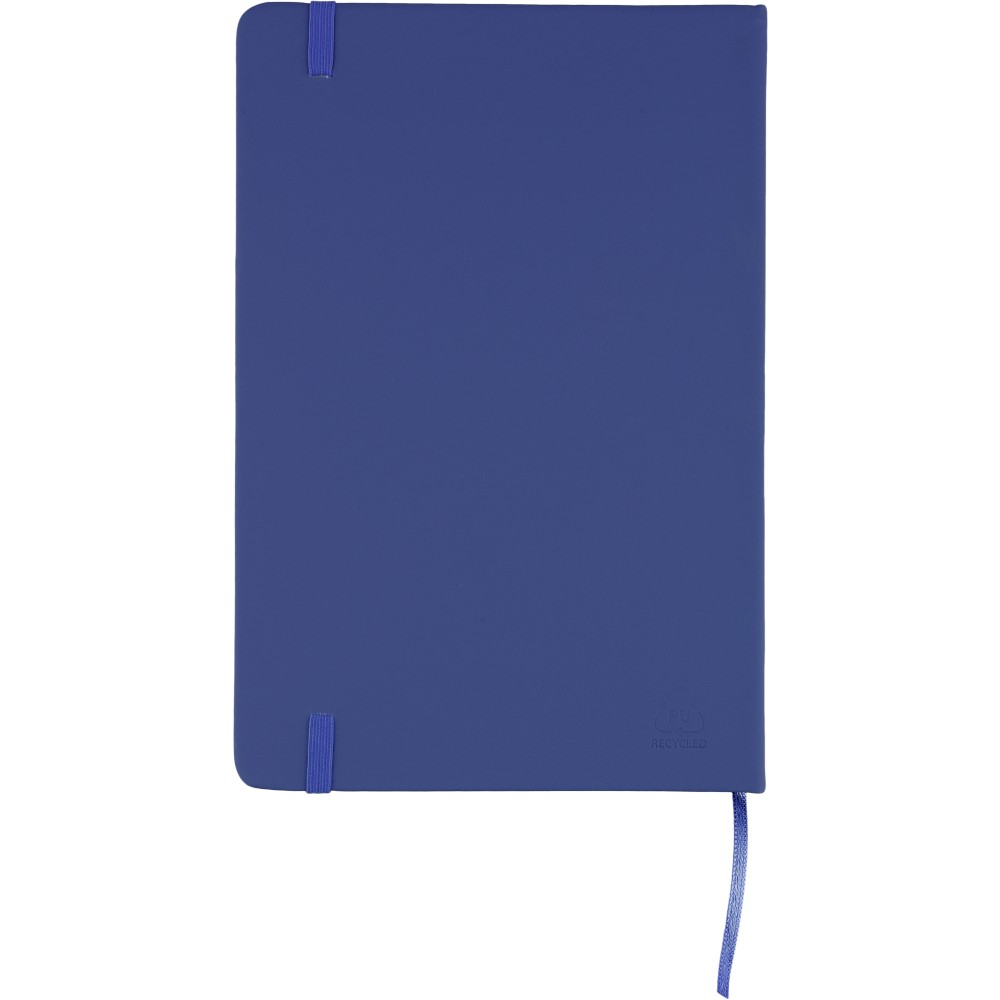 A5-ös méretű jegyzetfüzet rPET PU anyagból készült kemény borítóval, 80 vonalas lappal (70g/m2), színben illeszkedő gumipánttal és könyvjelző szalaggal. Az újrahasznosított anyagra utaló dombornyomott logóval a füzet hátoldalán.