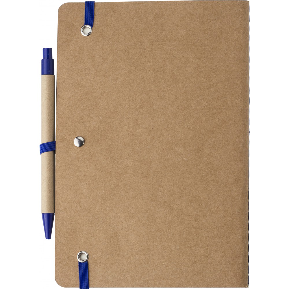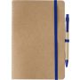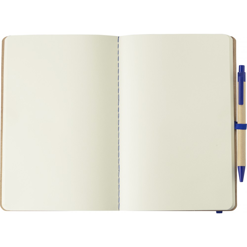 Újrahasznosított karton jegyzetfüzet 60 sima lappal. Tartalmazza a hozzáillő karton/szalma tollat kék tollbetéttel. Gumis összefogó pánt és tollhurok.