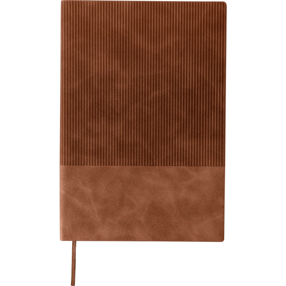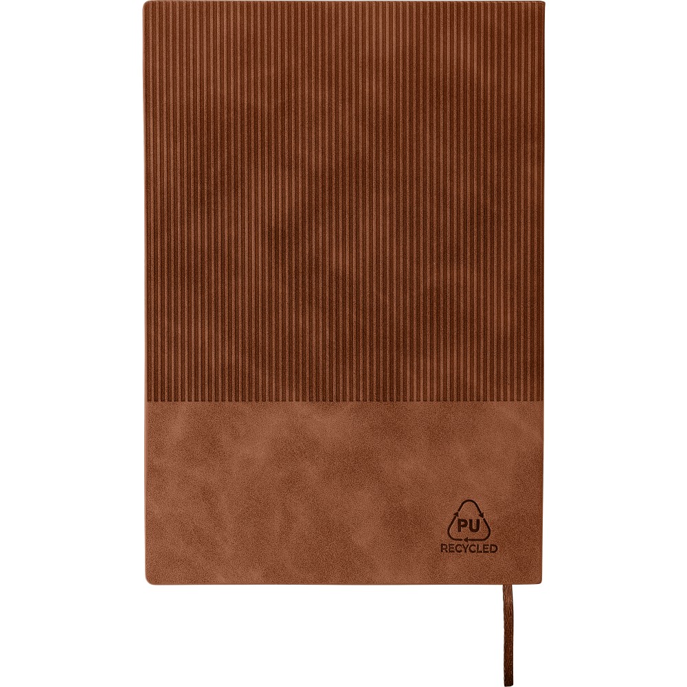 Újrahasznosított PU jegyzetfüzet, kb. A5-ös méretű, 100 lapos. Kemény borítóval és kordbársony hatású bevonattal az elülső és a hátlap felső részén. Tartalmaz egy szalagos könyvjelzőt és 80 g/m2-es vonalas lapokat. A hátoldalon dombornyomott újrahasznosított logóval.