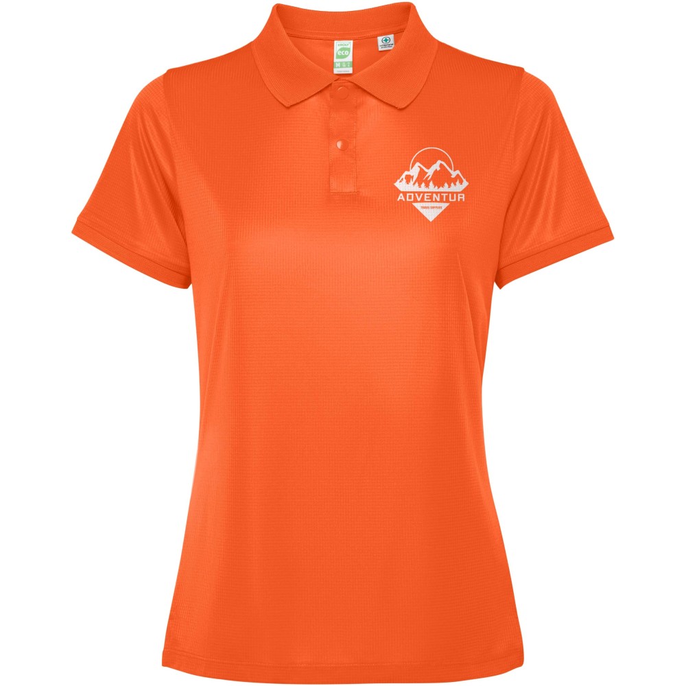 Rövidujjú galléros női póló. Erősített, fedett varrások a belső gallérban. 1x1 bordázott kézelő és gallér. Oldalsó varrások. 3 gombos nyakrész és oldalsliccek. 120g/m2.