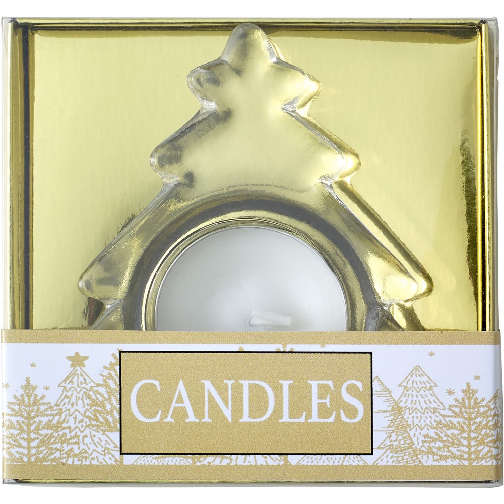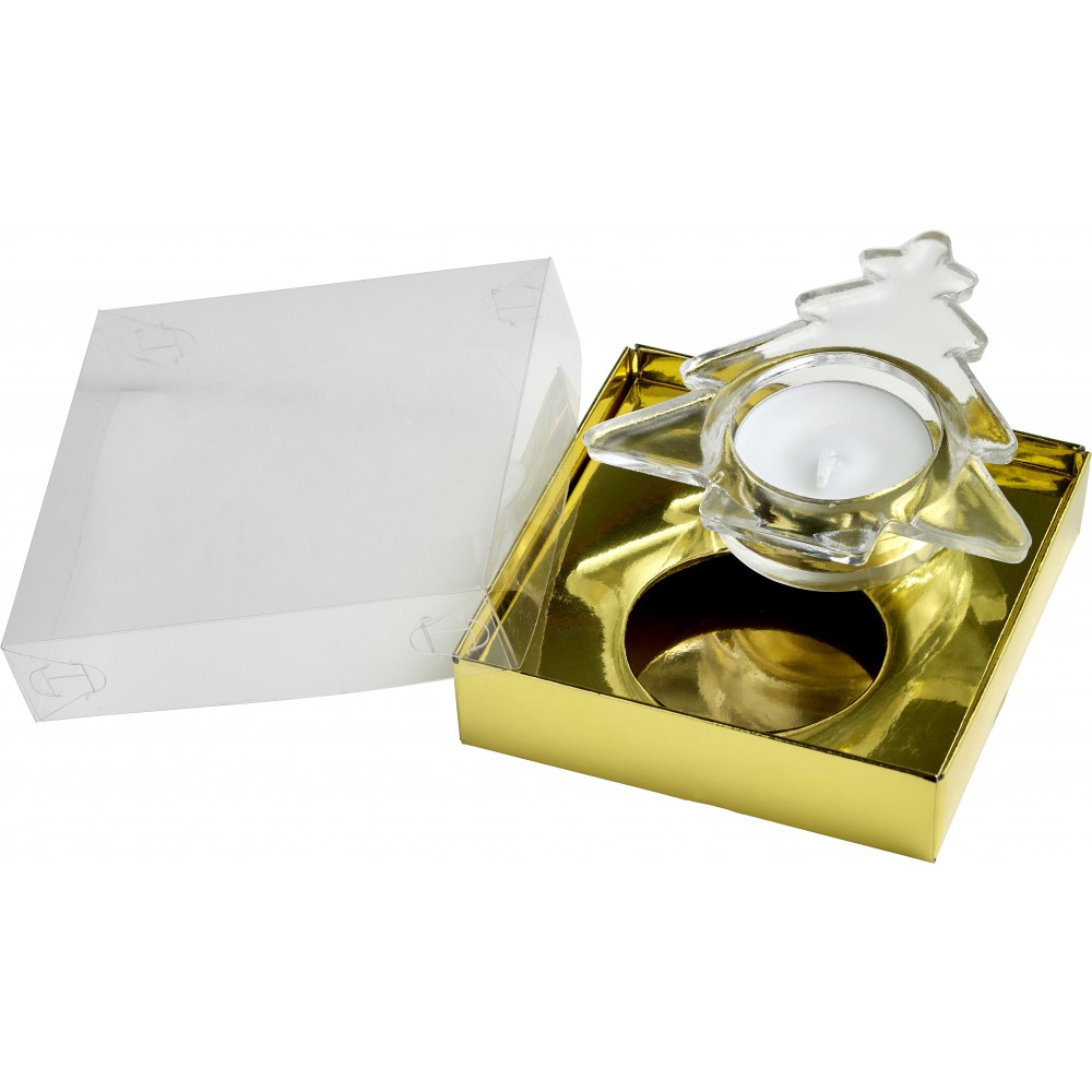 Fenyő alakú üveg gyertyatartó mécsessel. Csomagolása ajándékdoboz.