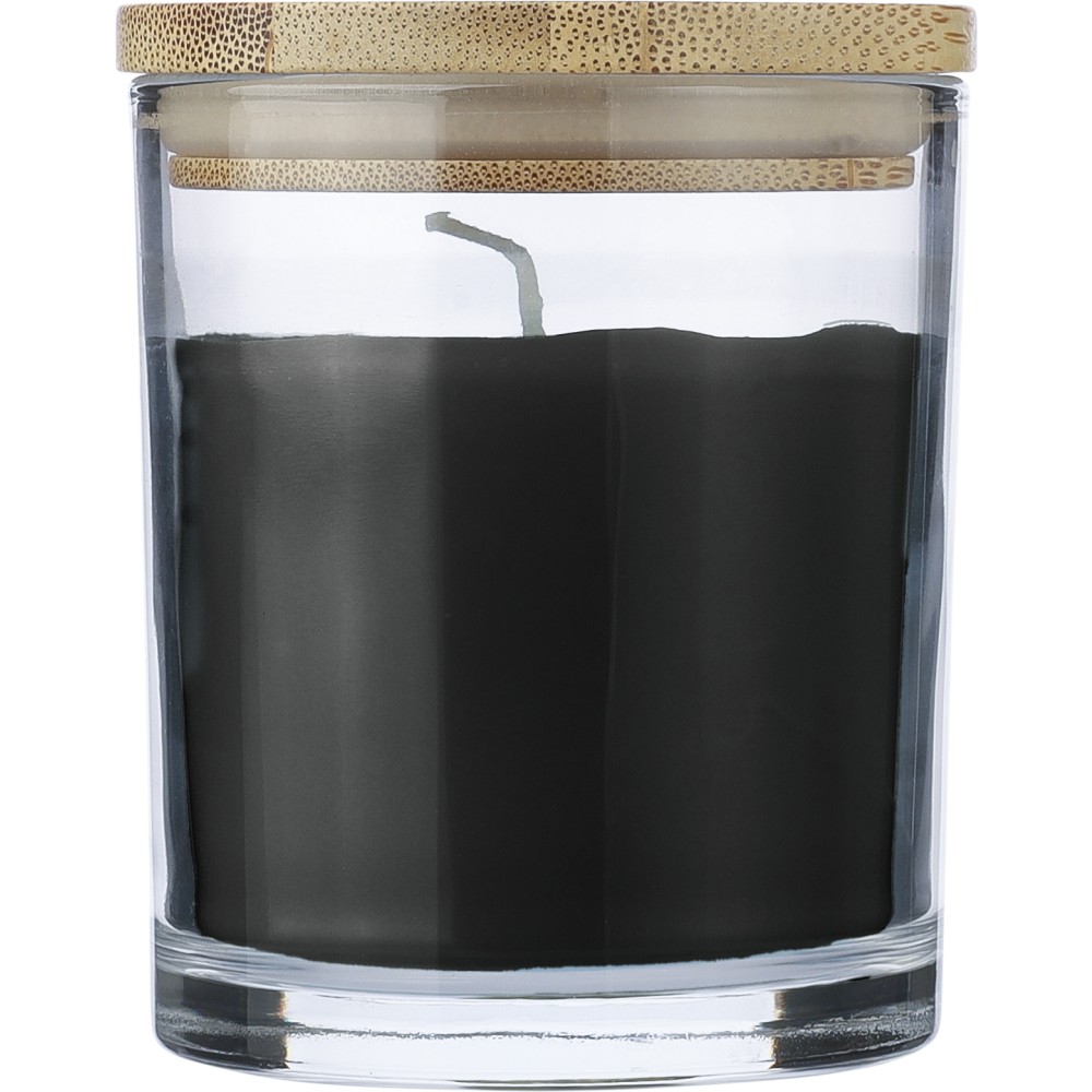 Üveg gyertyatartó 120 g vanília illatú, színes viasszal és bambusz fedéllel. Kb. 20 óra égési idővel. Csomagolása fehér papírhenger.