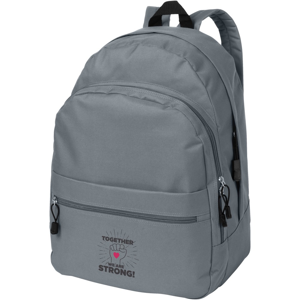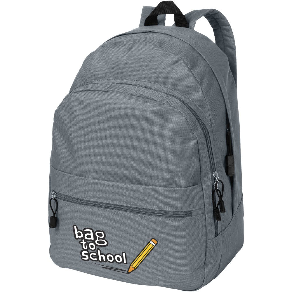 A kényelmes Trend hátizsák nyerő a promóciós hátizsákok között. A divatos kialakítású táska négy rekesszel rendelkezik: két cipzáras rekesszel, egy elülső cipzáras zsebbel és egy tépőzáras elülső zsebbel, így bőséges helyet kínál nagy és kis tárgyak tárolására egyaránt. A termék 600D poliészterből készült.