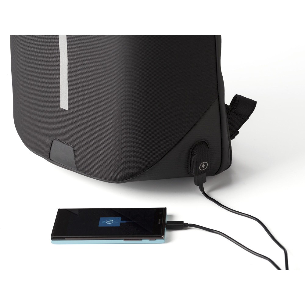 Hátizsák több belső zsebbel, párnázott rész a 15 -es laptop számára, párnázott, állítható vállpánt. 3 karakteres számkonbinációs lakat, fém fül, USB port és vezeték, fényvisszaverő csík, könnyített súlyeloszlást biztosító kialakítás. 1200D nylon anyag.