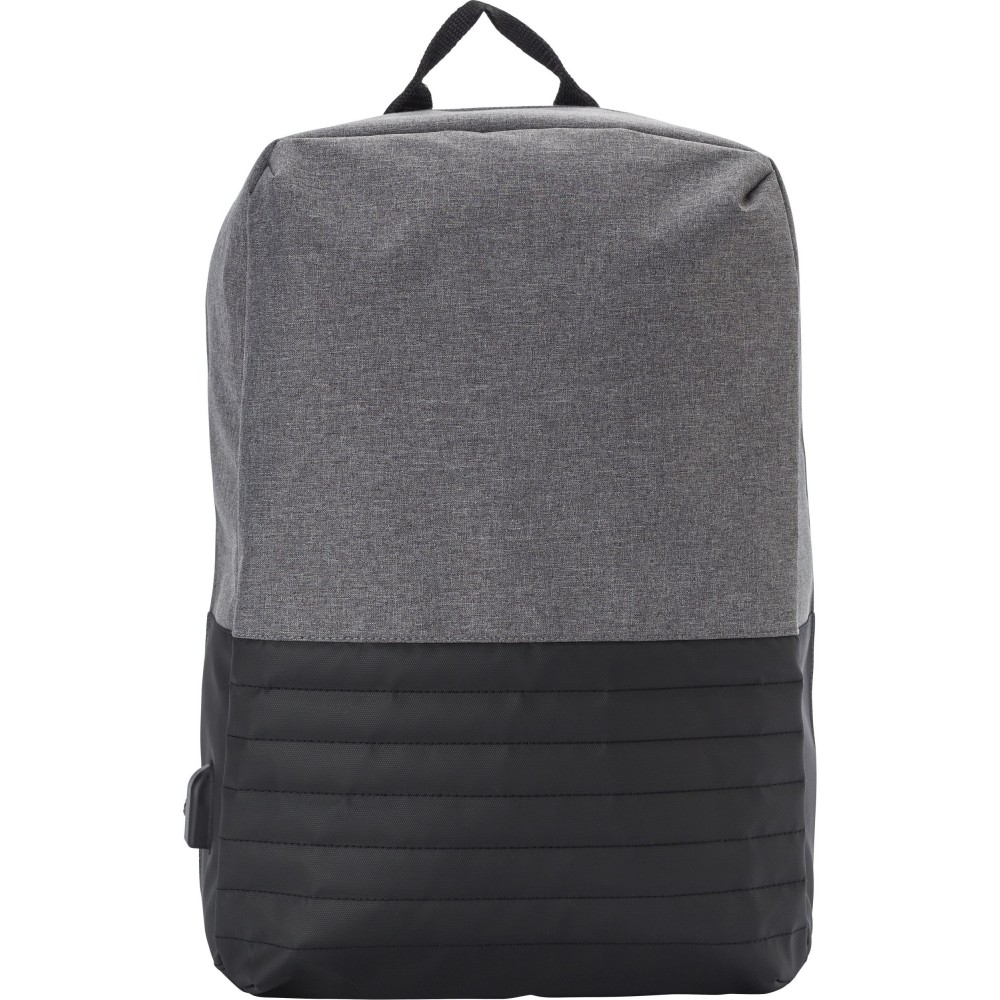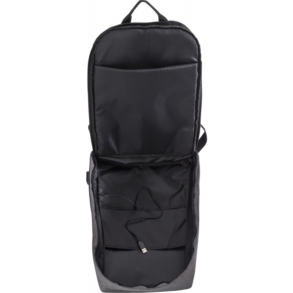 Kéttónusú lopásgátló hátizsák állítható és párnázott vállpánttal, párnázott hátkialakítással. Egy nagy fő rekesz cipzárral és párnázott laptop rekesszel (15 -os laptop számára). Külső USB-port, belül kábel. 600D + 300D PVC.