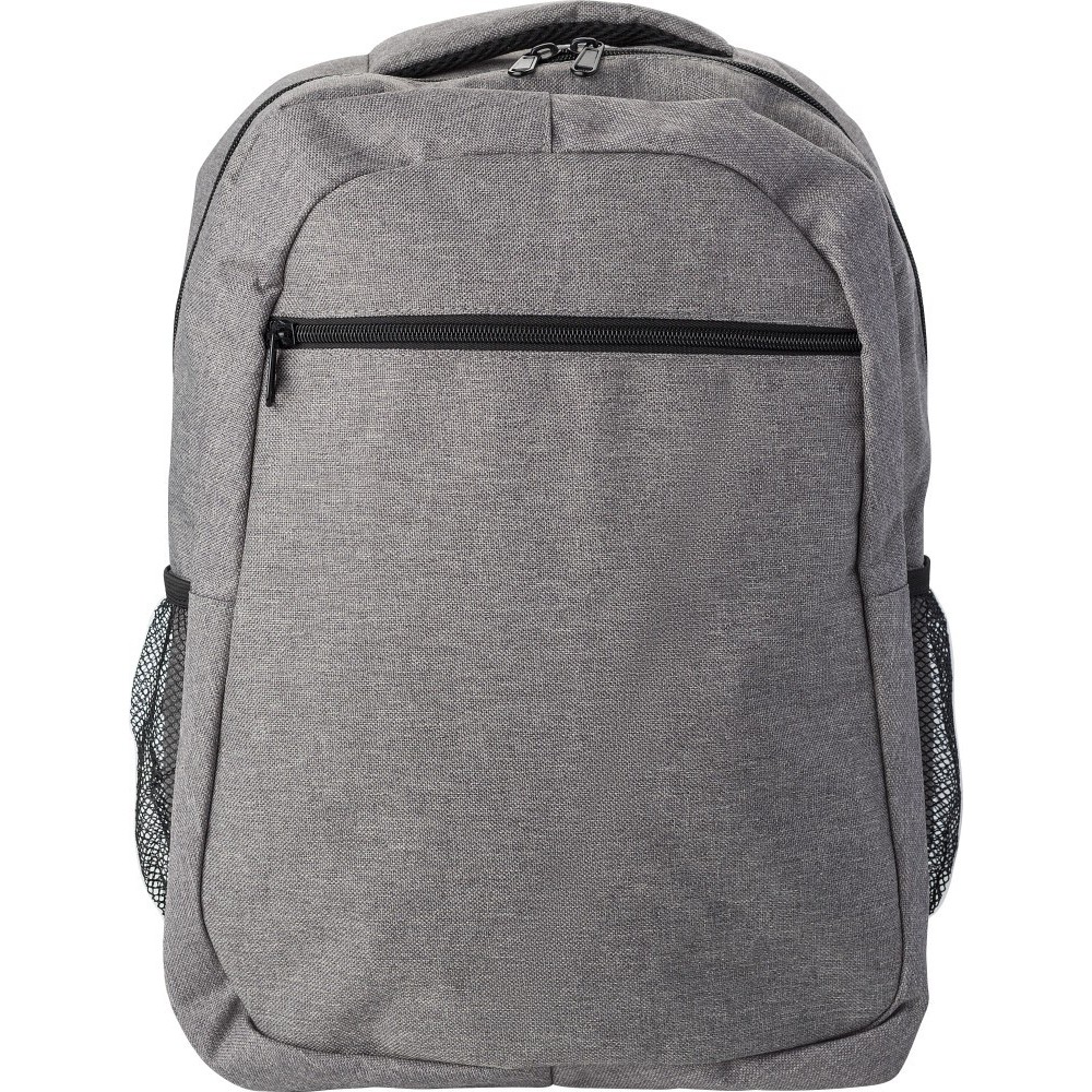 Hátizsák cipzáras elsőzsebbel és állítható vállpántokkal. Belső zseb laptop számára 15 -ig. 2 oldalon hálós zseb. 600D poliészter.