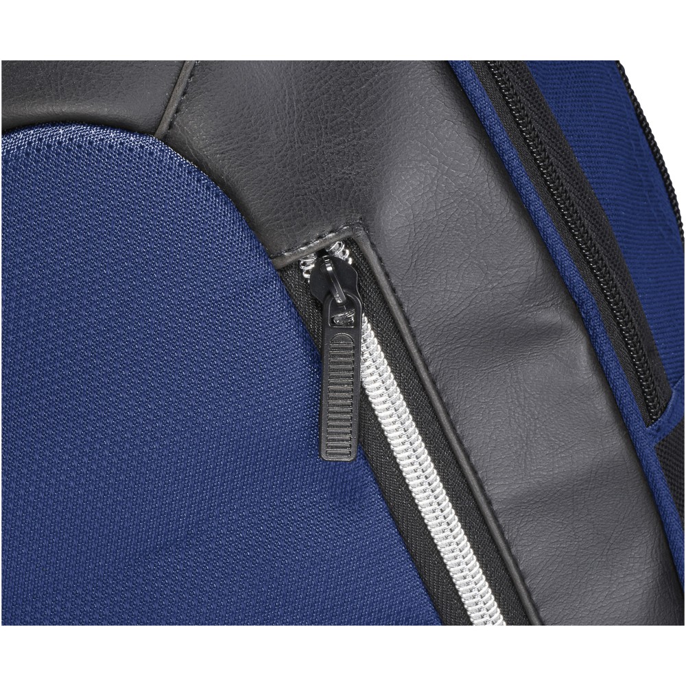 Elegáns, trendi, 15,6 -es laptop hátizsák nagy cipzáras, kulcstartós első zsebbel és rejtett RFID technológiájú blokkoló zsebbel a kártyák és okmányok adatlopás elleni védelme érdekében. A nagy, cipzáras fő tárolórész 15,6 -es laptop tárolására alkalmas, és elkölönített, párnázott résszel rendelkezik iPad vagy tablet számára. Az első, függőleges cipzár nyújt hozzáférést az első zsebhez. Két kiegészítő oldalzseb további tárolási lehetőséget biztosít, a párnázott, állítható vállpántok kényelmes viseletet nyújtanak, a hordozófül és a gurulós bőröndre húzható zseb lehetővé teszi a könnyű hordozást.