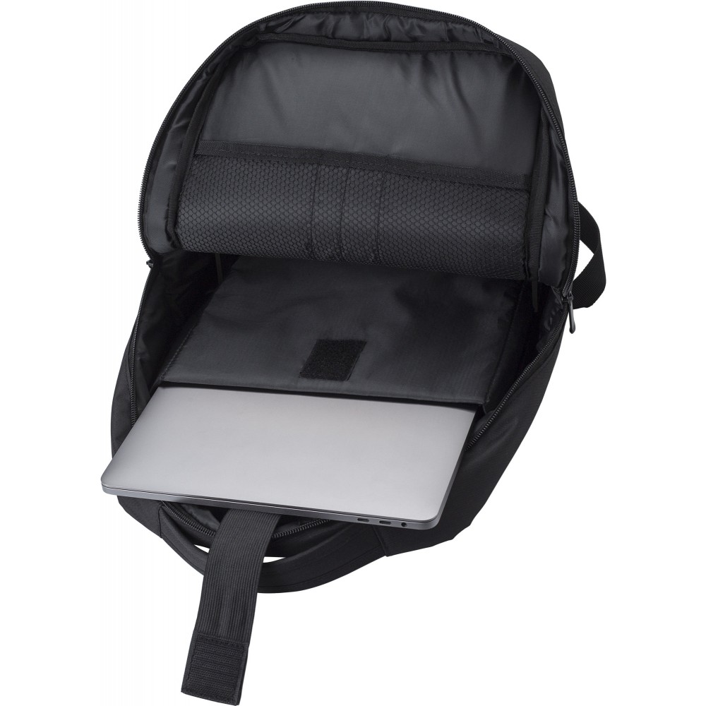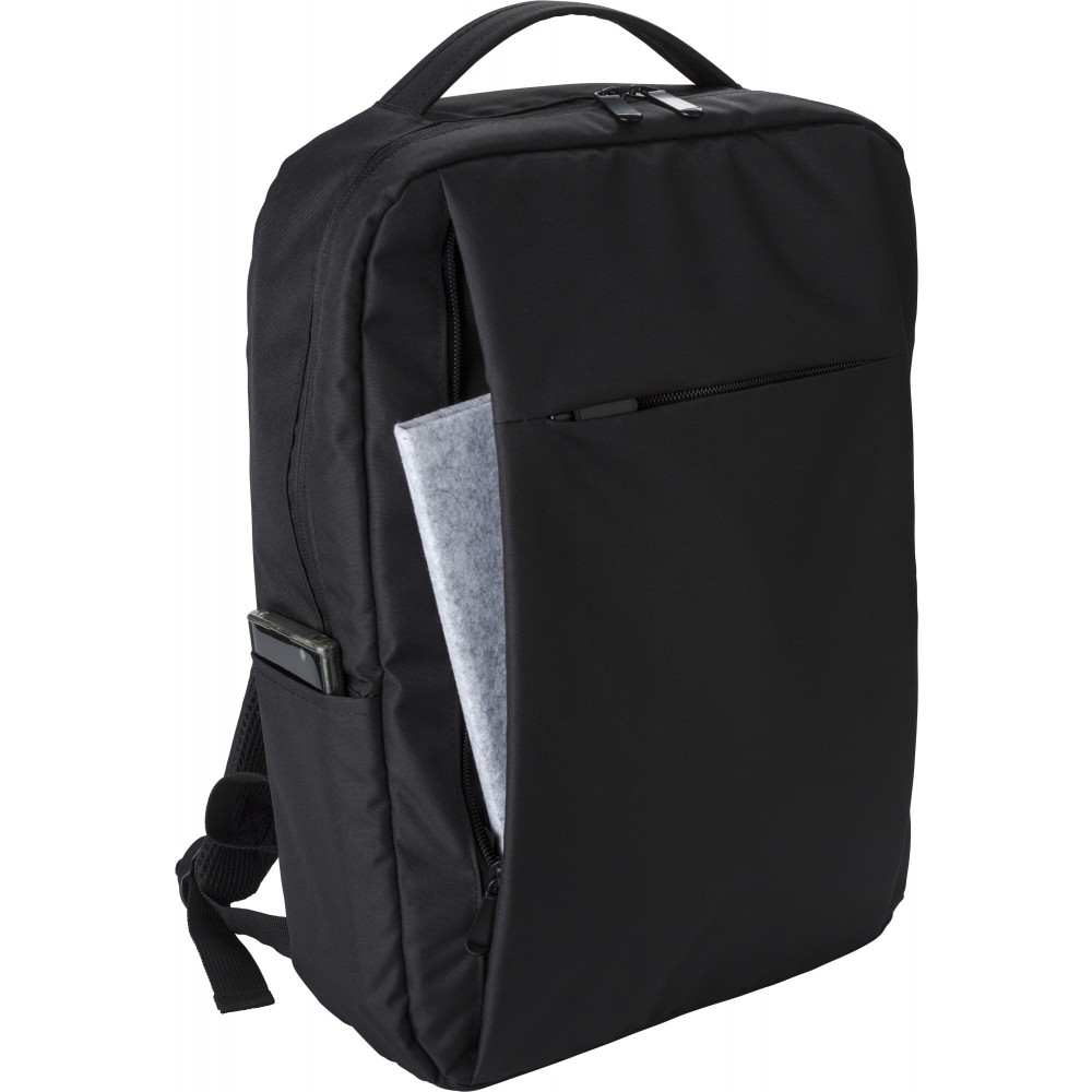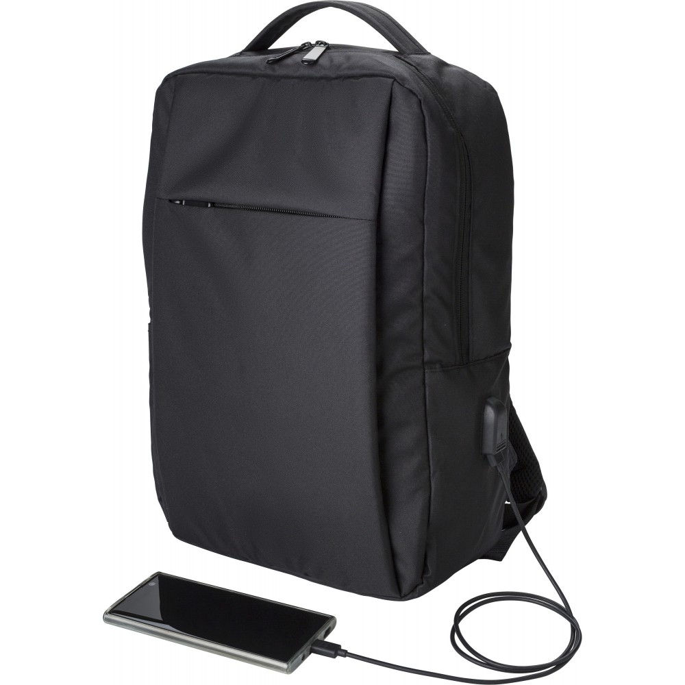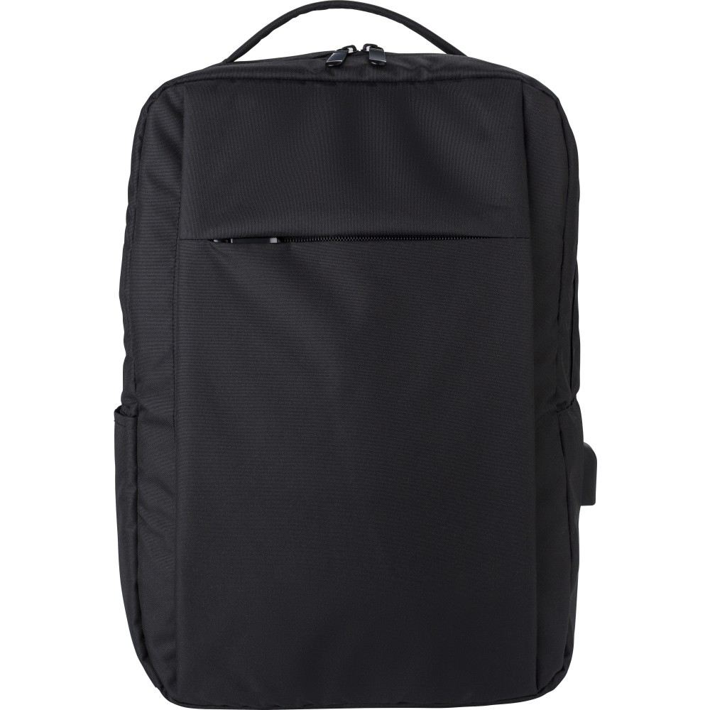 Laptophátizsák 16 -es laptop számára. Belül több zsebbel, laptoptartó rész tépőzárral, egy elülső cipzáras zsebbel. Oldalt USB-A kimenet. RPET 300D és 210D anyag.