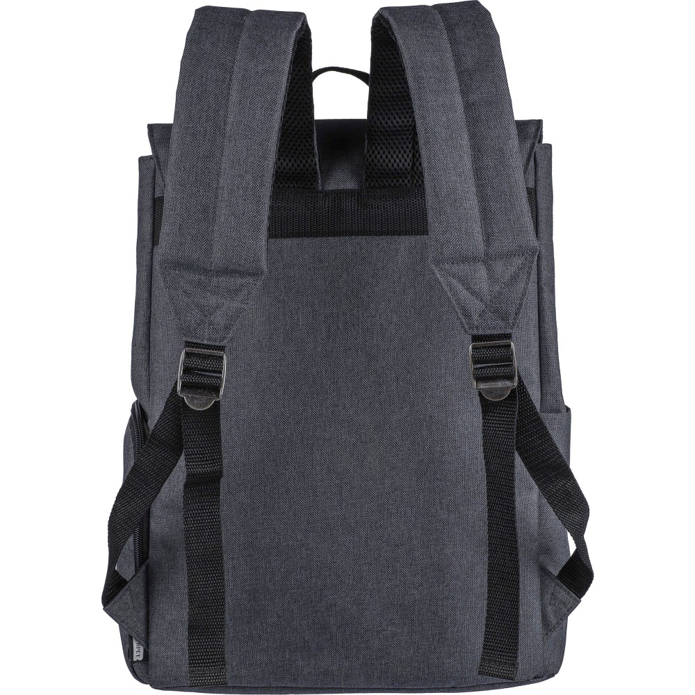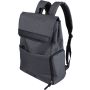 Laptophátizsák 15 -es laptop számára, PVC részletekkel és 210D béléssel. Kis cipzáras elülső zsebbel rendelkezik, benne egy kulcsokhoz rögzíthető karabinerrel, egy cipzáras oldalzsebbel, egy normál oldalzsebbel, valamint egy nagy, mágneszáras rekesszel, amely laptopzsebet tartalmaz. Oldalt nyomógombokkal zárható, ha nincs teljesen megtöltve. Állítható, szellőző pántokkal. Az elülső részen rPET anyagra utaló címke található. Anyaga: 600D poliészter vászon.