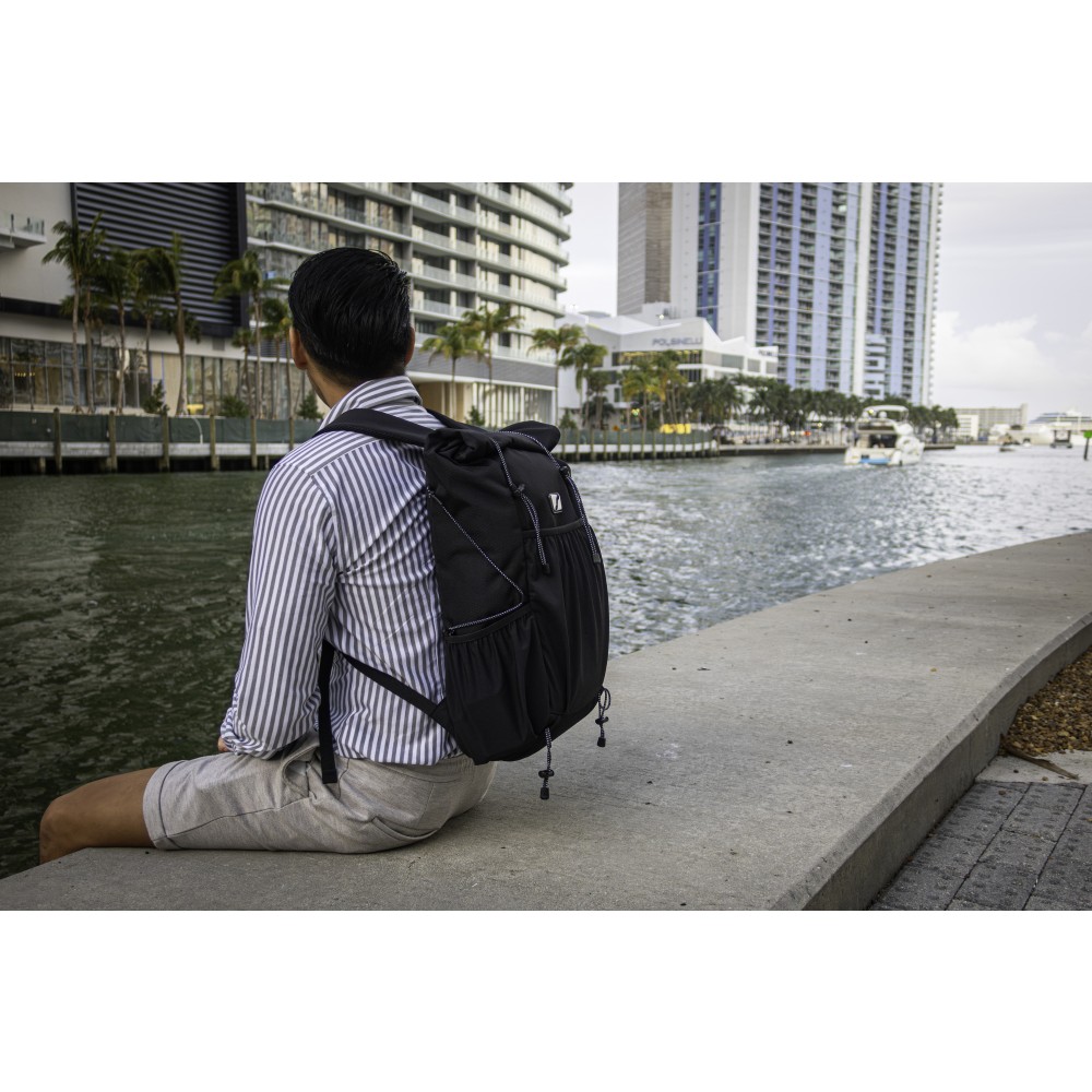 A Venturer roll-top hátizsák egyszerre stílusos és környezetbarát kiegészítő, így kiváló céges ajándék. Újrahasznosított PET-palackokból készült, és a fenntarthatóság iránti elkötelezettséget tükrözi, miközben elegáns dizájnt kínál. Tágas fő rekeszében, több sztreccs zsebében és párnázott laptoprekeszében (16 -es laptop is elfér) bőséges tárolást biztosít a legfontosabb dolgoknak. A könnyű és helytakarékos Venturer ideális ingázáshoz, utazáshoz vagy hétköznapi kirándulásokhoz. Jellemzők: állítható vállpánt, roll-top záródás, szellőző vállpántok, valamint víz- és folttaszító anyag.