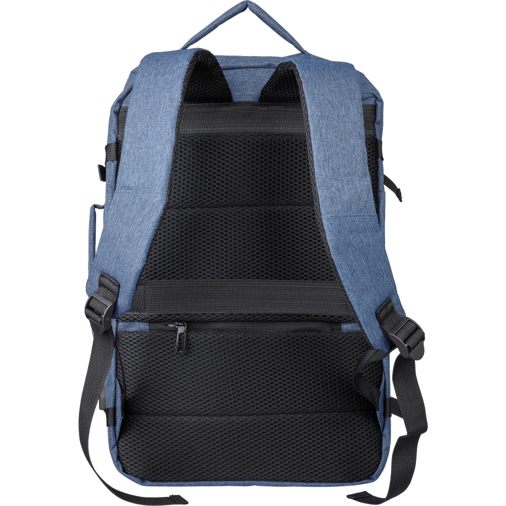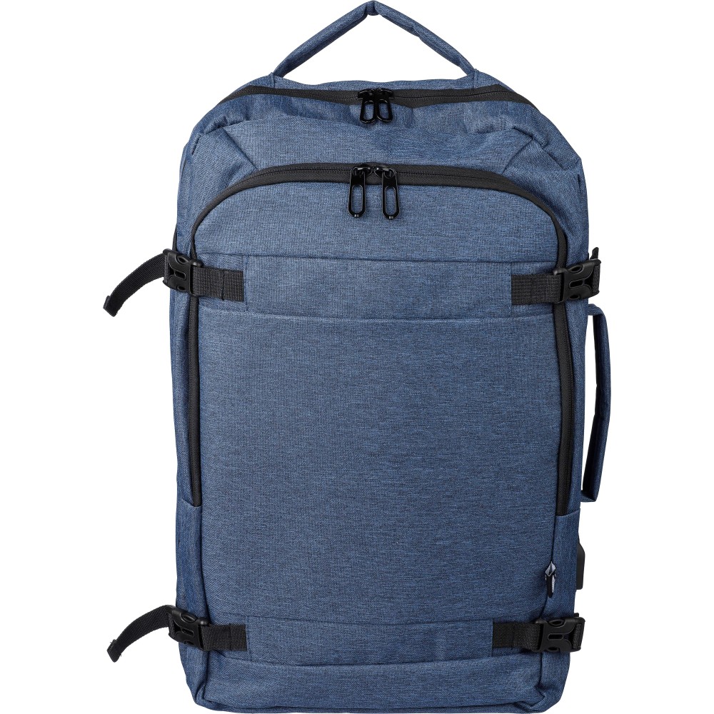 Hátizsák és laptoptáska 17 -es készülékhez. Kézipoggyász méretű. Hordozófüllel a tetején és oldalain. Tépőzáras laptop rekesszel, lopásgátló zsebbel és két nagy cipzáras rekesszel. Szellőző, párnázott hátoldallal, bőröndre húzható pánttal, zárócsatokkal és oldalsó USB-A porttal rendelkezik. Oldalsó csatok segítik a csomag kompakt tartását. Terhelhetősége kb. 12 kg. RPET alapanyagra utaló címke. Anyaga: 300D rPET poliészter.