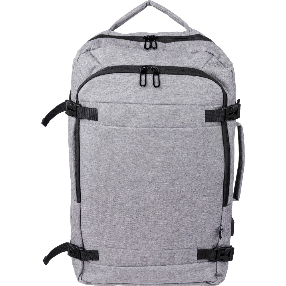 Hátizsák és laptoptáska 17 -es készülékhez. Kézipoggyász méretű. Hordozófüllel a tetején és oldalain. Tépőzáras laptop rekesszel, lopásgátló zsebbel és két nagy cipzáras rekesszel. Szellőző, párnázott hátoldallal, bőröndre húzható pánttal, zárócsatokkal és oldalsó USB-A porttal rendelkezik. Oldalsó csatok segítik a csomag kompakt tartását. Terhelhetősége kb. 12 kg. RPET alapanyagra utaló címke. Anyaga: 300D rPET poliészter.