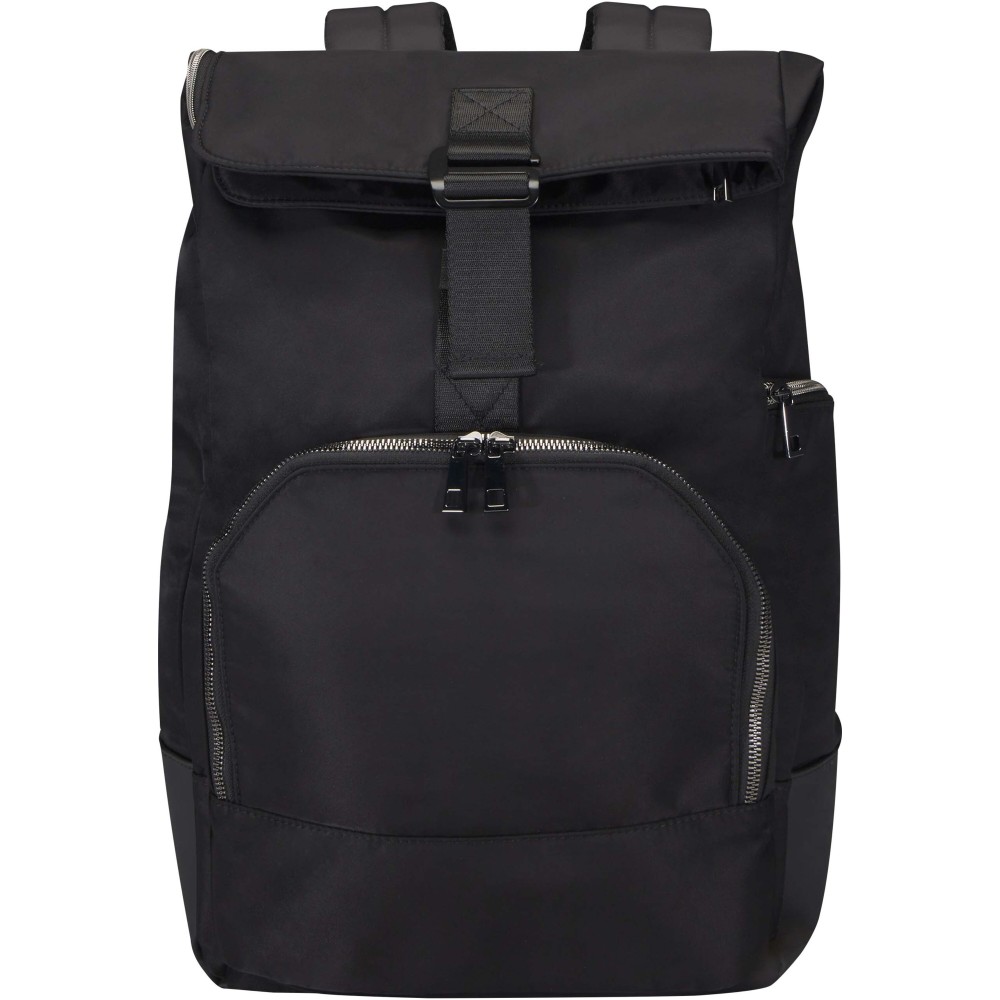 A Rhine rolltop hátizsák elegáns stílusával és sokoldalúságával tökéletesen illeszkedik a munkához és a szabadidős tevékenységekhez egyaránt. Kiváló minőségű, GRS tanúsítvánnyal rendelkező újrahasznosított nejlonból készült, puha RPET béléssel és prémium műbőr elemekkel. A hátizsák dedikált, 15?-os laptoprekesszel, valamint két további zsebbel rendelkezik elektronikus kiegészítők számára. A főrekesz praktikus L-alakú cipzáras nyílással és két zsebbel van ellátva, emellett található benne egy cipzáras rendszerező elülső zseb és egy oldalzseb is. A maximális hordozási kényelmet a párnázott, állítható vállpántok és a PU bevonatú felső fül biztosítja. Űrtartalma: 18 liter. Teherbírás: akár 10 kg. PVC-mentes.