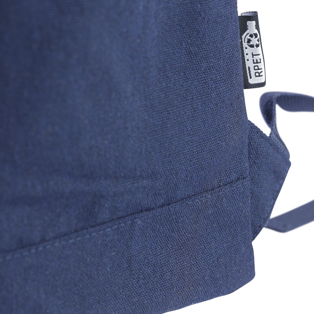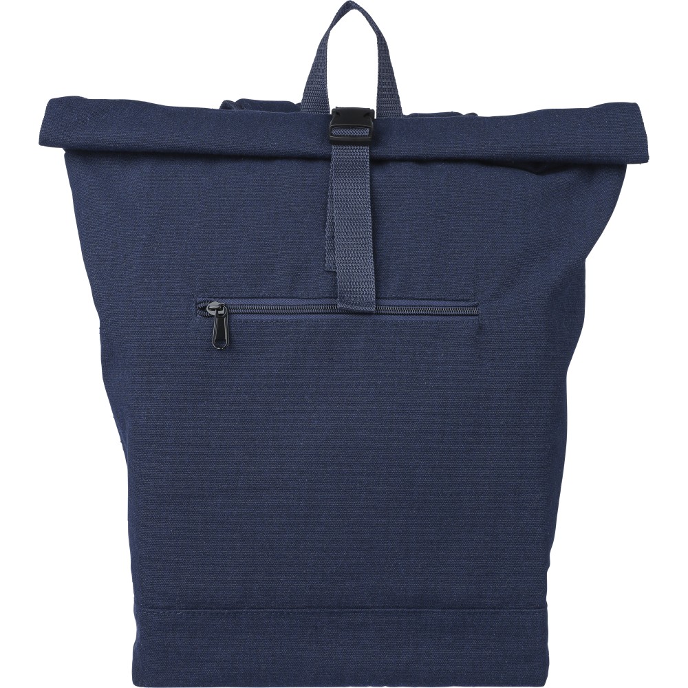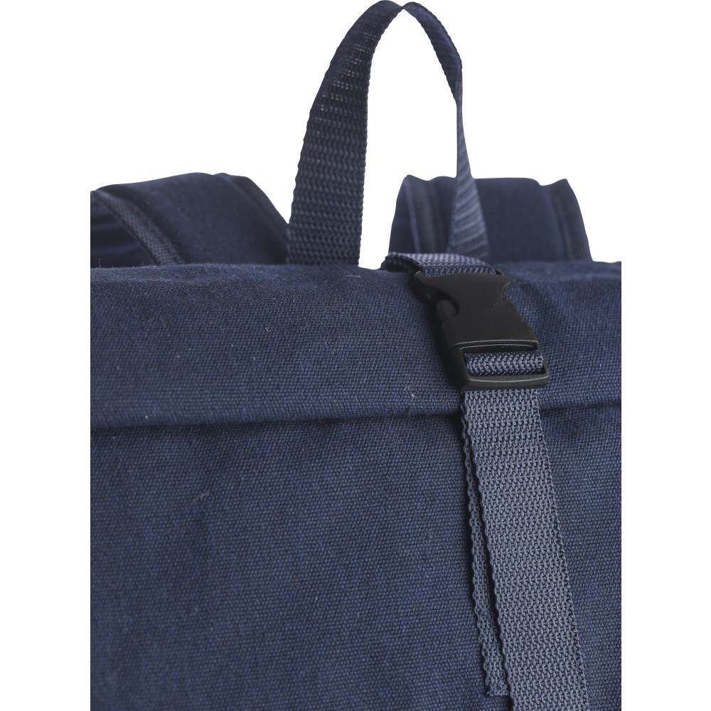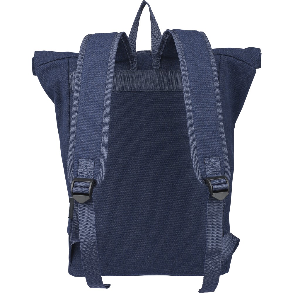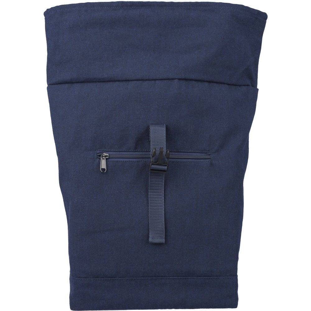 Rolltop hátizsák 330 g/m2 újahasznosított policotton anyagból, 210D poliészter béléssel és műanyag csattal. 15 literes űrtartalommal, egy nagy cipzáras rekesszel, 15 -es laptoptartó résszel, két belső és egy külső rekesszel. Tetején hordozófüllel, párnázott, állítható vállpánttal és egy kicsi, cipzáras elsőzsebbel. Teherbíró képessége 14 kg. Címkét tartalmaz.