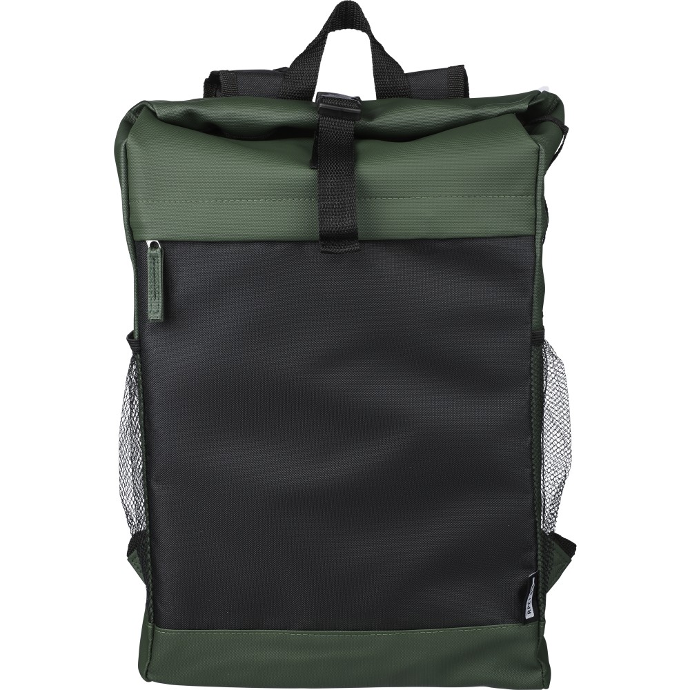 600D rPET poliészter roll-top hátizsák. PU bevonat teszi vízlepergetővé. Rejtett cipzáras első zsebbel, hálós oldalzsebekkel, 15 -es laptop számára kialakított tárolórésszel, 5 tárolórekesszel, állítható vállpánttal. Kapacitása 25 liter, teherbírása 15 kg. Oldalán rPET címkével.